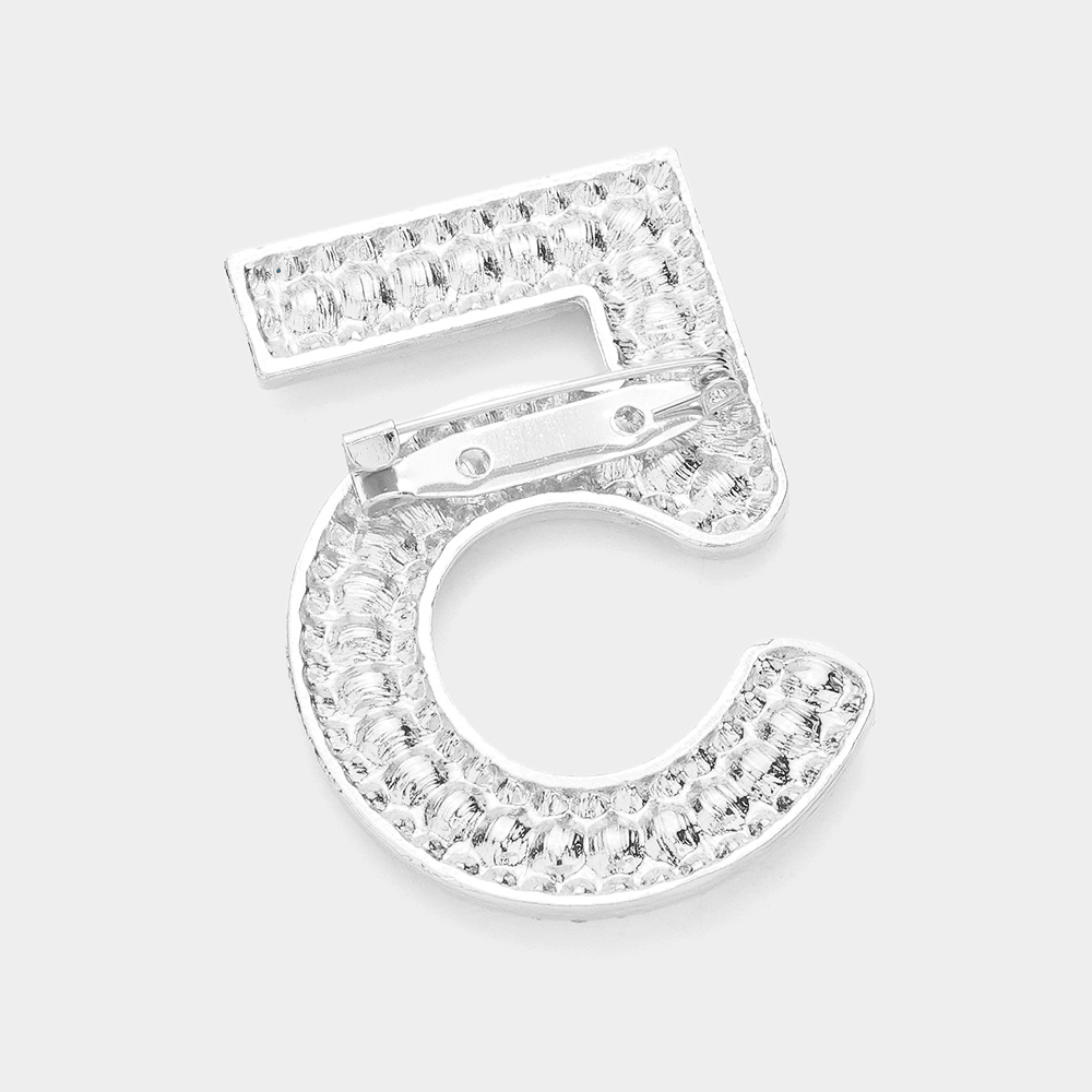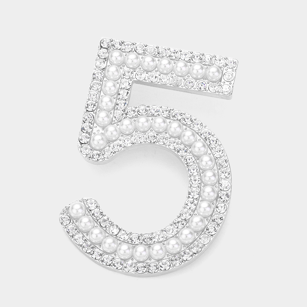 Stone Paved Pearl Embellished Number Five Pin Brooch