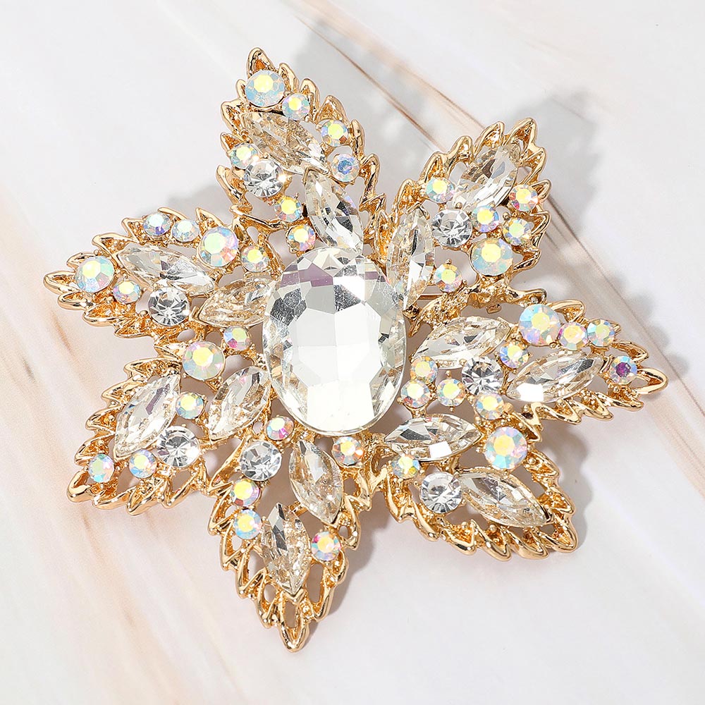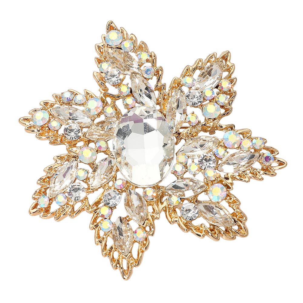 • This ornate floral brooch features an intricately layered design with a bold faceted centerpiece surrounded by shimmering accents. Its radiant, sculpted silhouette adds a refined touch to formalwear, evening outfits, or special-occasion ensembles, creating a timeless statement full of sophistication.