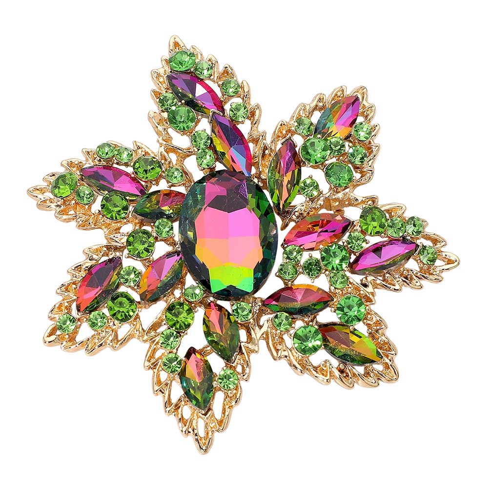 • This ornate floral brooch features an intricately layered design with a bold faceted centerpiece surrounded by shimmering accents. Its radiant, sculpted silhouette adds a refined touch to formalwear, evening outfits, or special-occasion ensembles, creating a timeless statement full of sophistication.