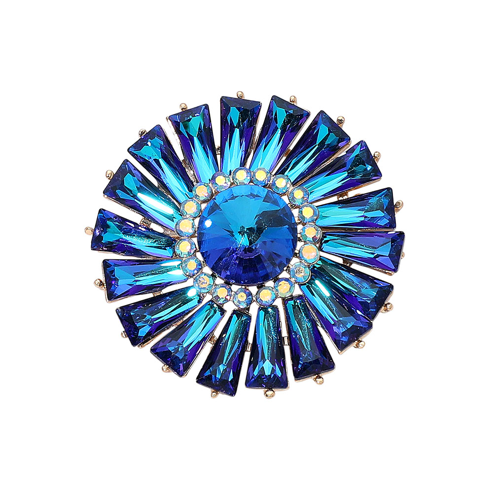 Details • Size : 1.75" X 1.75 • Pin Brooch • Make a statement with this radiant burst brooch featuring a dazzling faceted gemstone centerpiece surrounded by precision-cut accents. Its bold, symmetrical design adds instant glamour, perfect for elevating evening wear, formal attire, or stylish outerwear. • Lead and Nickel Compliant