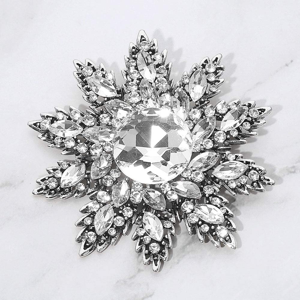 Details • Size : 3.3" X 3.5" • Pin Brooch • Make a statement with this crystal floral starburst brooch, featuring a radiant layered design and a brilliant center stone that catches the light beautifully. A versatile accessory for elevating jackets, scarves, handbags, or special occasion looks. • Lead and Nickel Compliant