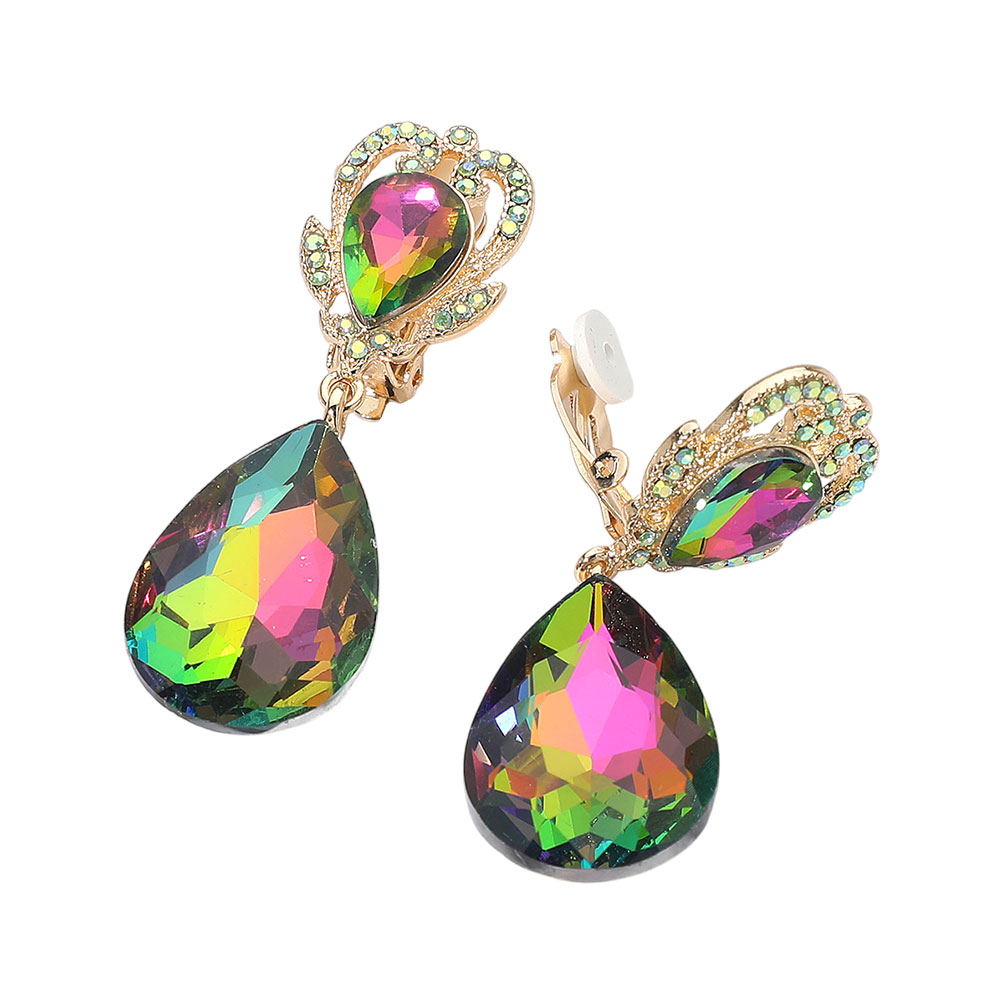 Ornate Top Faceted Teardrop Stone Dangle Clip On Evening Earrings