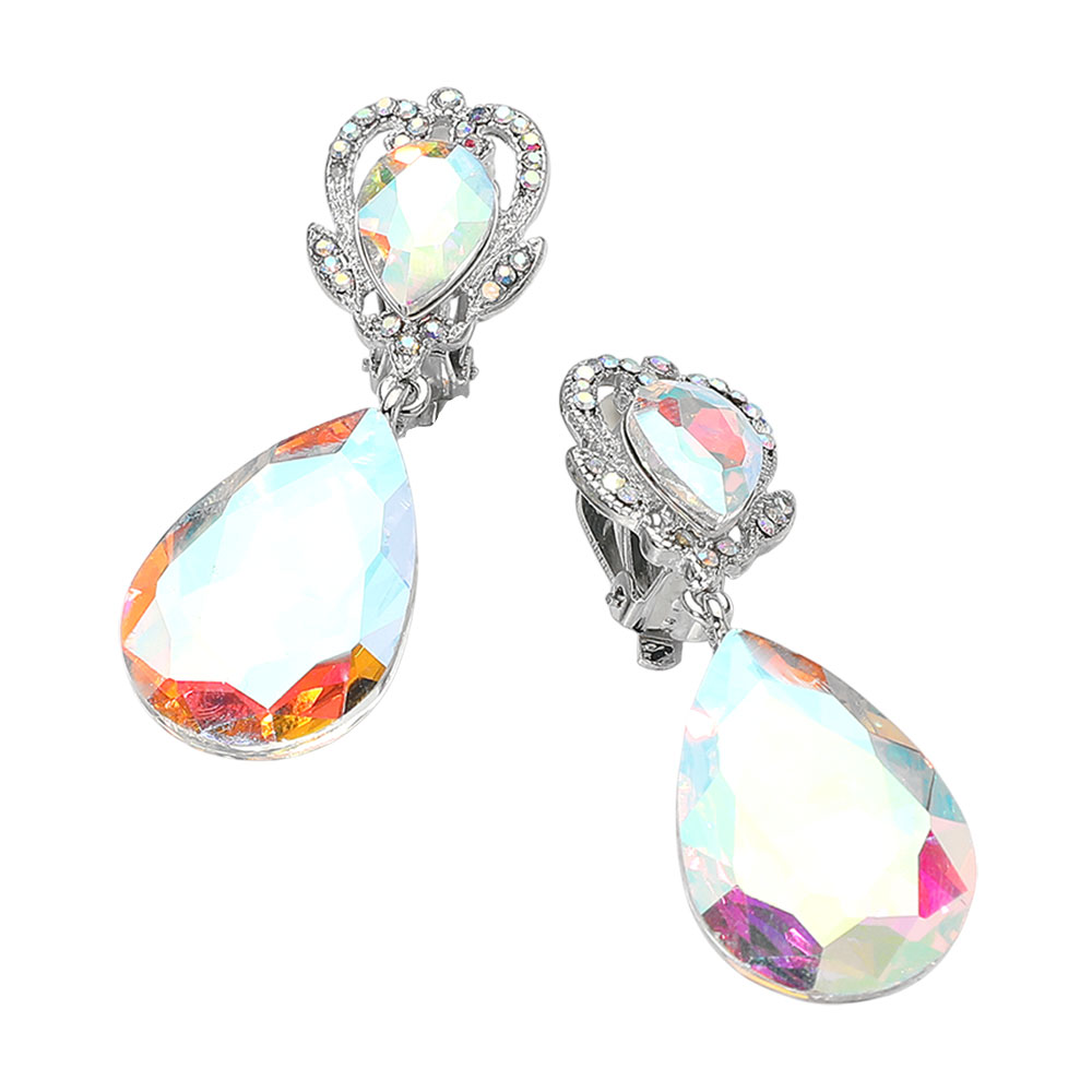 • Bold clip-on statement earrings featuring a large faceted teardrop drop and an ornate decorative top for an elegant, dramatic look. Designed for comfortable wear without piercing, perfect for evening events, formal outfits, or adding a touch of glamour.