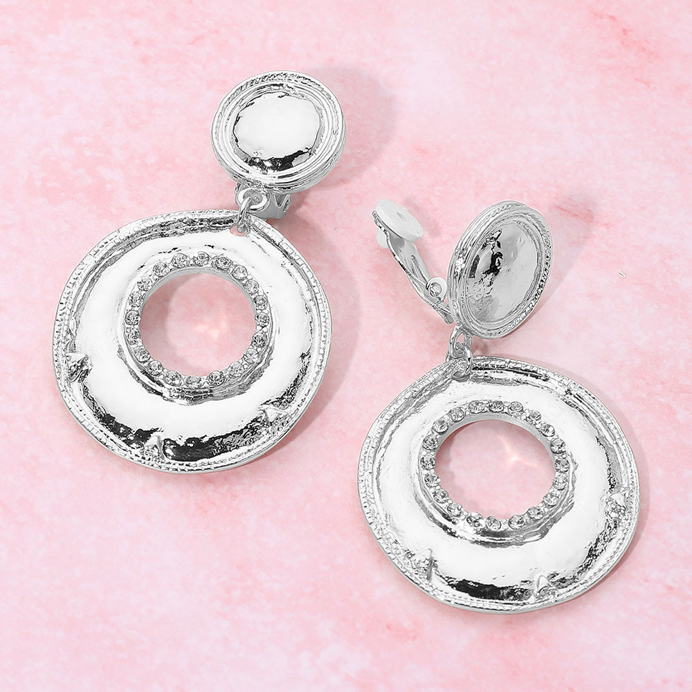 Rhinestone Accent Textured Metal Ring Drop Clip On Earrings