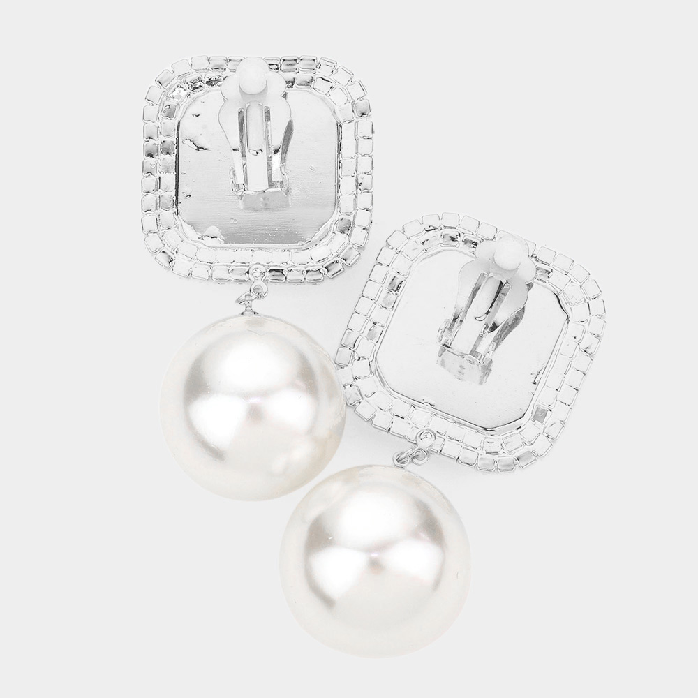 Square Stone Pearl Link Dangle Evening Clip on Earrings