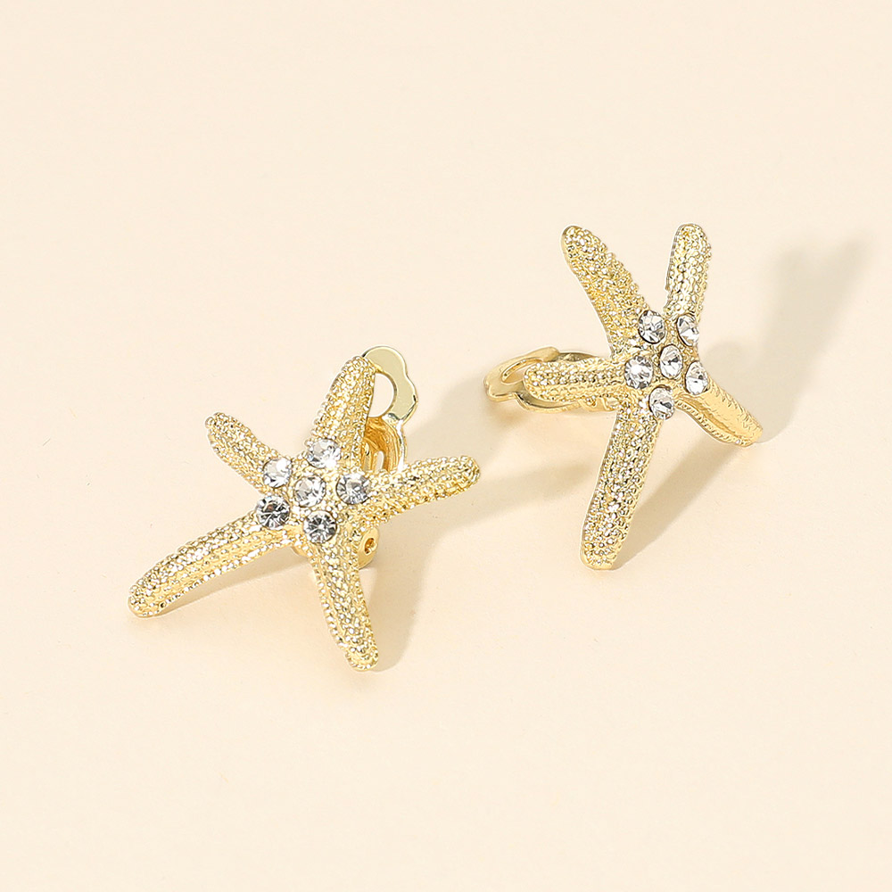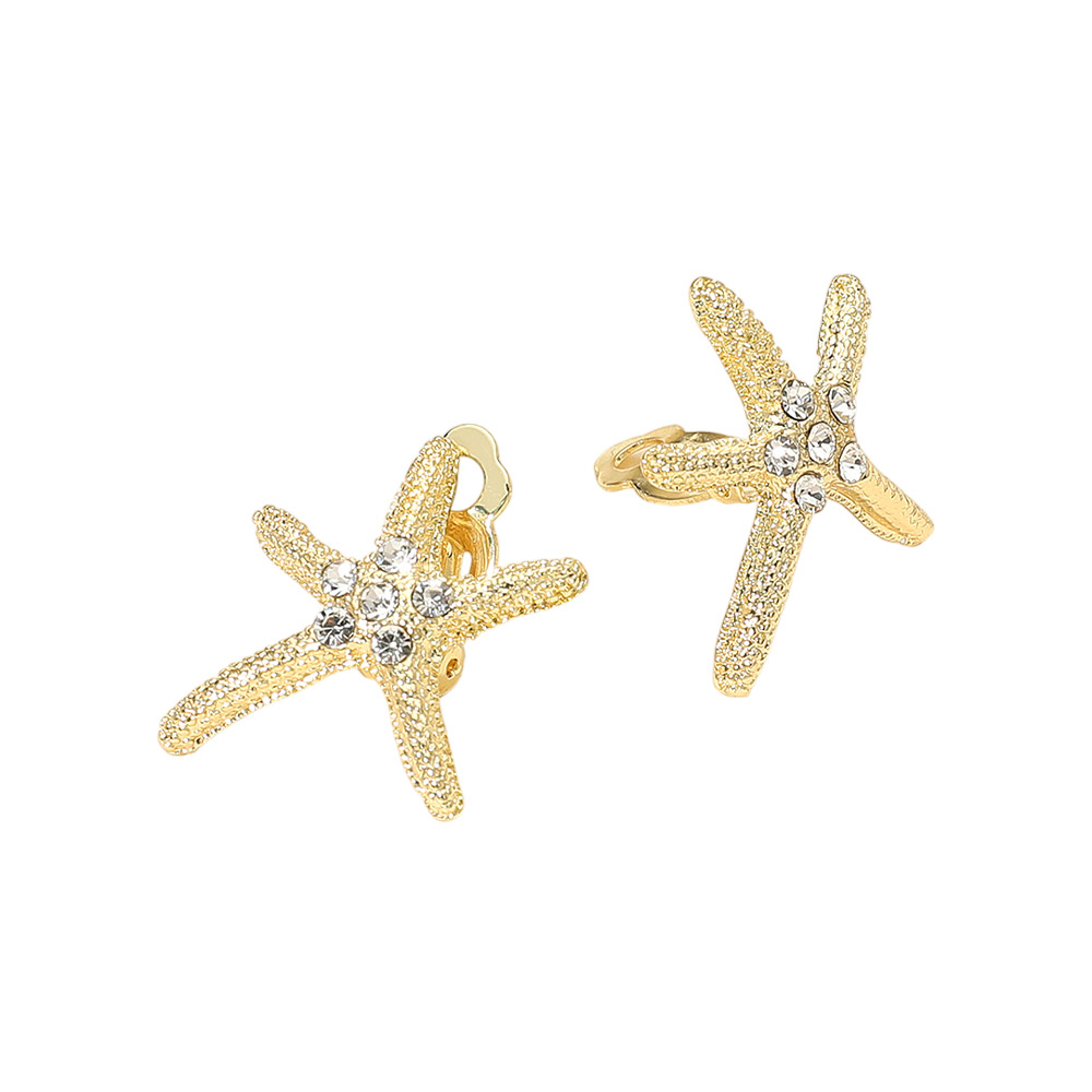 Details • Size : 1" X 1" • Clip On • These starfish crystal clip-on earrings bring a touch of seaside elegance to any look. Featuring a detailed textured design accented with shimmering stones, they offer a playful yet refined style. Perfect for adding a radiant finish to summer outfits or special occasions. • Lead and Nickel Compliant