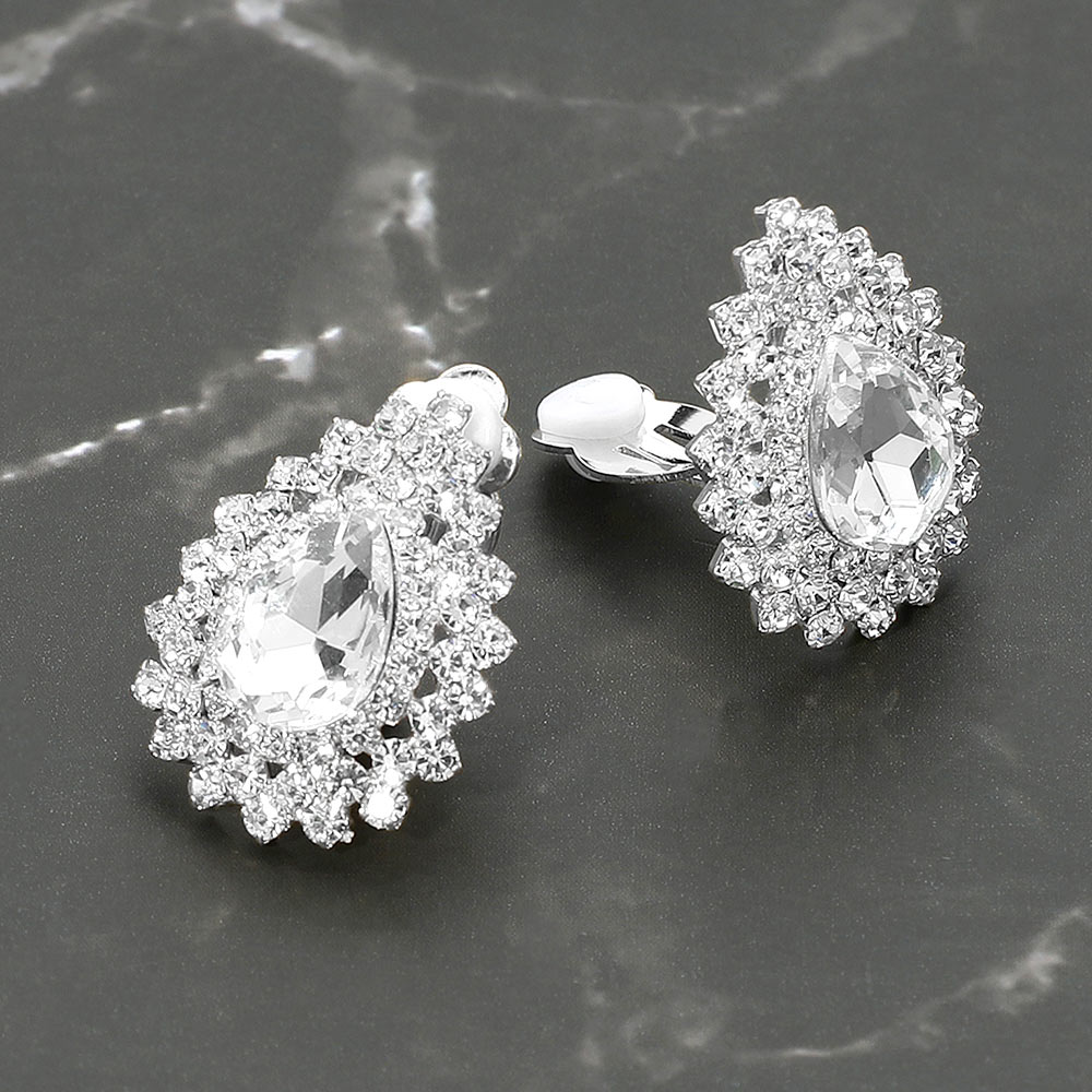 • Glamorous teardrop crystal cluster clip-on earrings designed with a sparkling layered halo for a radiant, eye-catching finish. Their elegant, non-pierced design offers comfortable wear for formal events, parties, bridal looks, or any occasion that calls for a touch of refined brilliance.