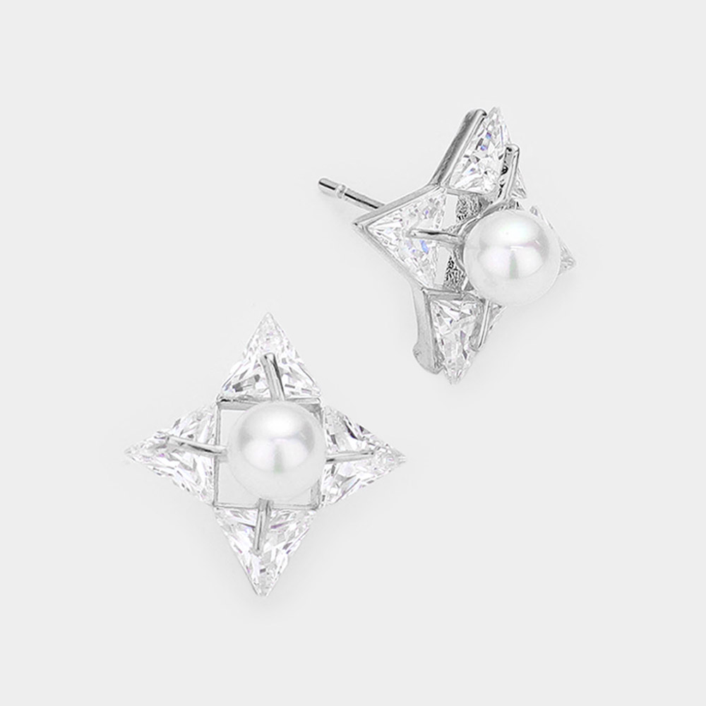 Pearl Centered Crystal CZ Stone Star Stud Earrings