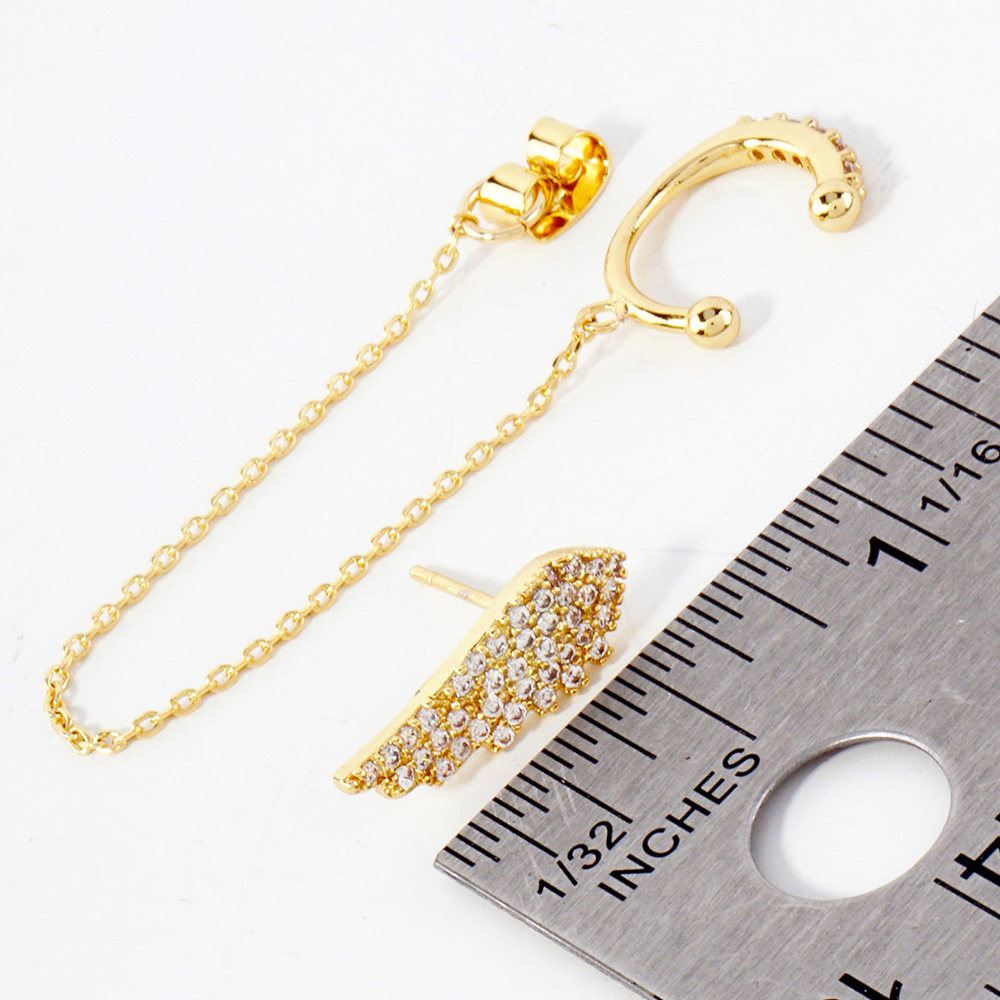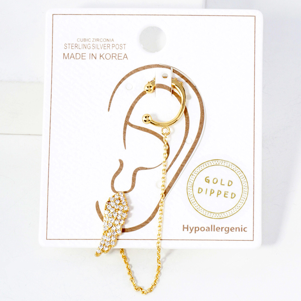 Details • Size : 0.8" X 2.2" • This gold-dipped chain earring features a stunning wing design adorned with sparkling cubic zirconia, linked elegantly to a matching ear cuff. Crafted with hypoallergenic sterling silver posts, it offers a perfect mix of glamor and comfort for modern, sophisticated styling. • CZ Cubic Zirconia • Gold Dipped • Hypoallergenic • Lead and Nickel Compliant • Made In Korea • Sterling Silver Post