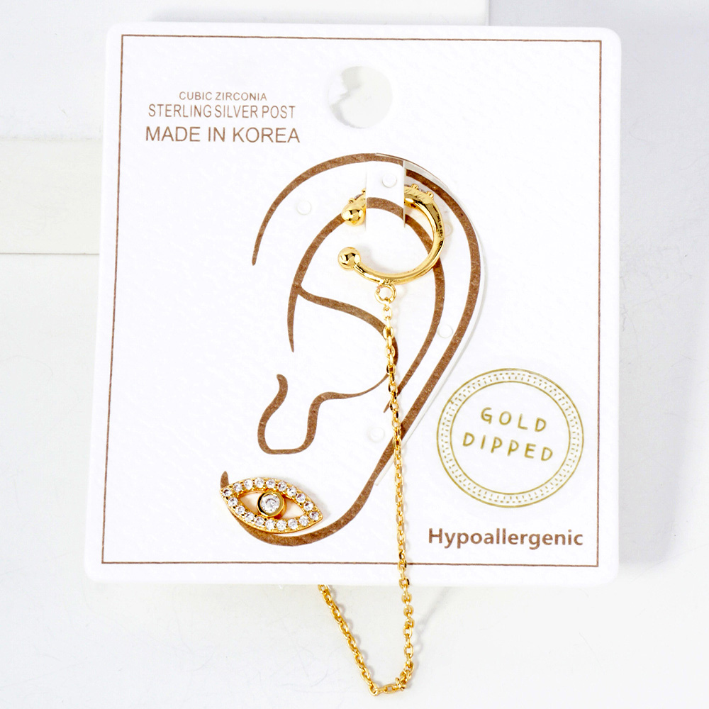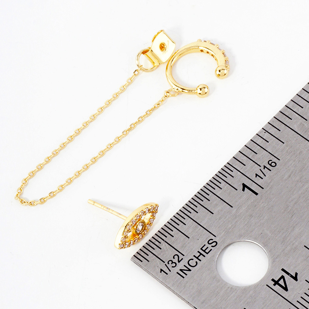 Details • Size : 0.9" X 2.2" • This elegant gold-dipped chain earring features a sparkling evil eye design set with cubic zirconia and paired with a sleek ear cuff. Crafted with hypoallergenic sterling silver posts, it blends modern charm and timeless symbolism, perfect for adding subtle protection and shine. • CZ Cubic Zirconia • Gold Dipped • Hypoallergenic • Lead and Nickel Compliant • Made In Korea • Sterling Silver Post