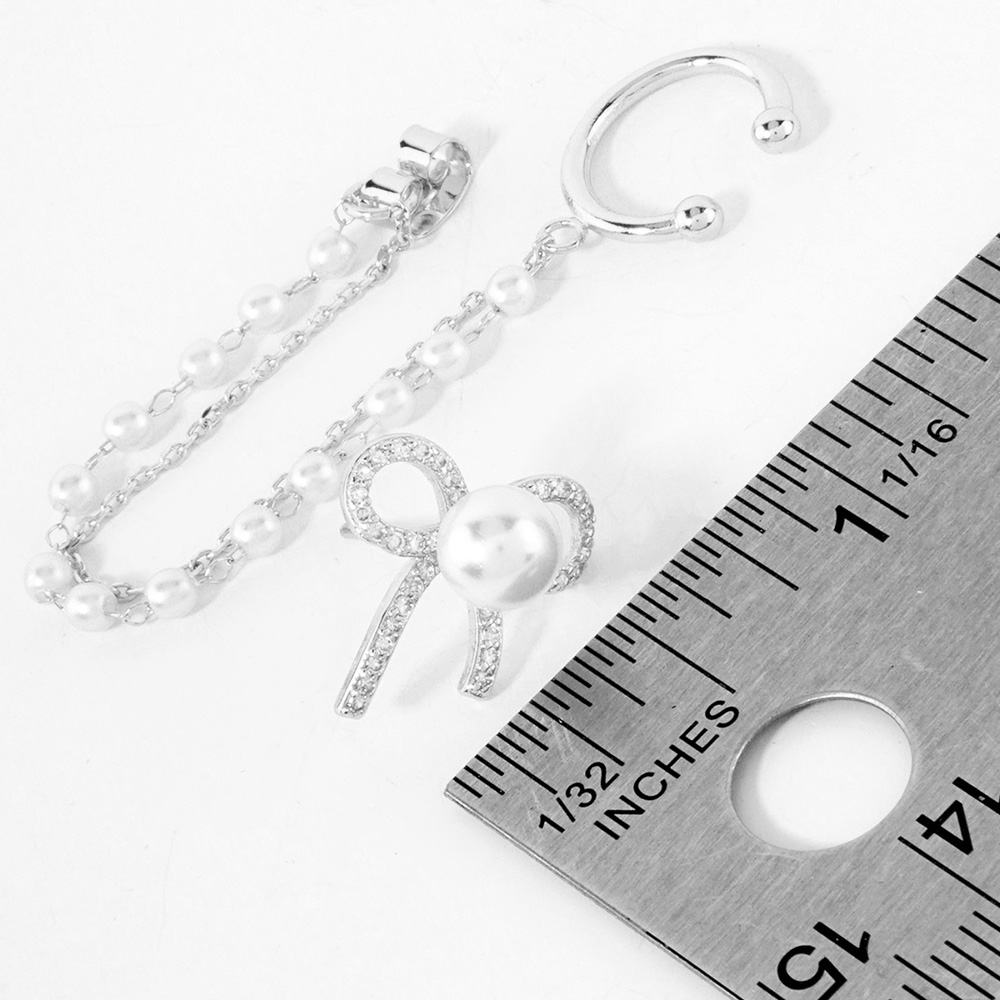 Details • Size : 1" X 2.2" • This white gold-dipped chain earring features a graceful bow adorned with cubic zirconia and a lustrous pearl centerpiece, connected to an elegant ear cuff by dual pearl-accented chains. Designed with hypoallergenic sterling silver posts, it offers a refined and feminine touch for any occasion. • Lead and Nickel Compliant • Hypoallergenic • Made In Korea • Gold Dipped • CZ Cubic Zirconia • Sterling Silver Post
