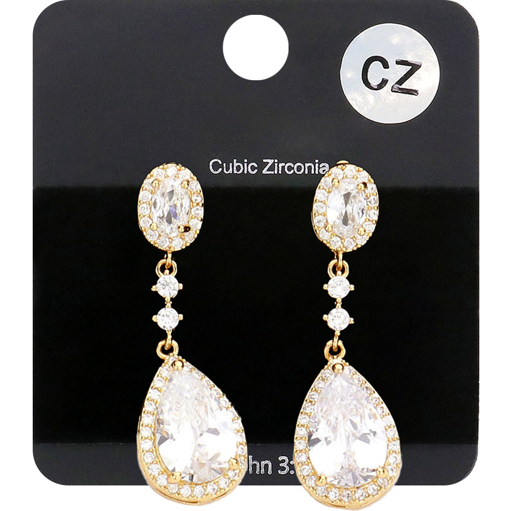 Details • Size : 0.4" X 1.3" • Post Back • These cubic zirconia teardrop dangle earrings showcase an elegant combination of oval and drop-shaped stones that radiate timeless beauty. Designed for formal occasions or special events, they bring sophistication and sparkle to any outfit, making them a graceful statement piece. • Lead and Nickel Compliant • CZ Cubic Zirconia