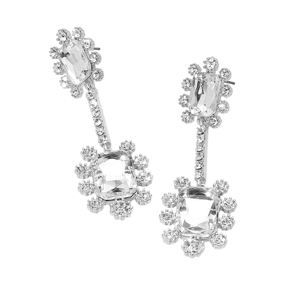 Details • Size : 0.8" X 3" • Post Back • Sophisticated drop earrings featuring radiant crystals and delicate floral-inspired halos. A timeless accessory perfect for weddings, evening events, or formal wear. • Lead and Nickel Compliant