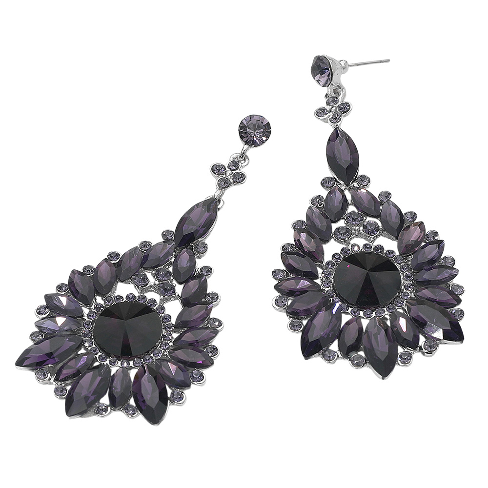 Details • Size : 1.6" X 3.7" • Post Back • Make an unforgettable impression with these statement teardrop crystal earrings. Designed with intricate faceted stones in a radiant arrangement, they capture light beautifully for a luxurious look—perfect for evening events, weddings, and glamorous nights out.