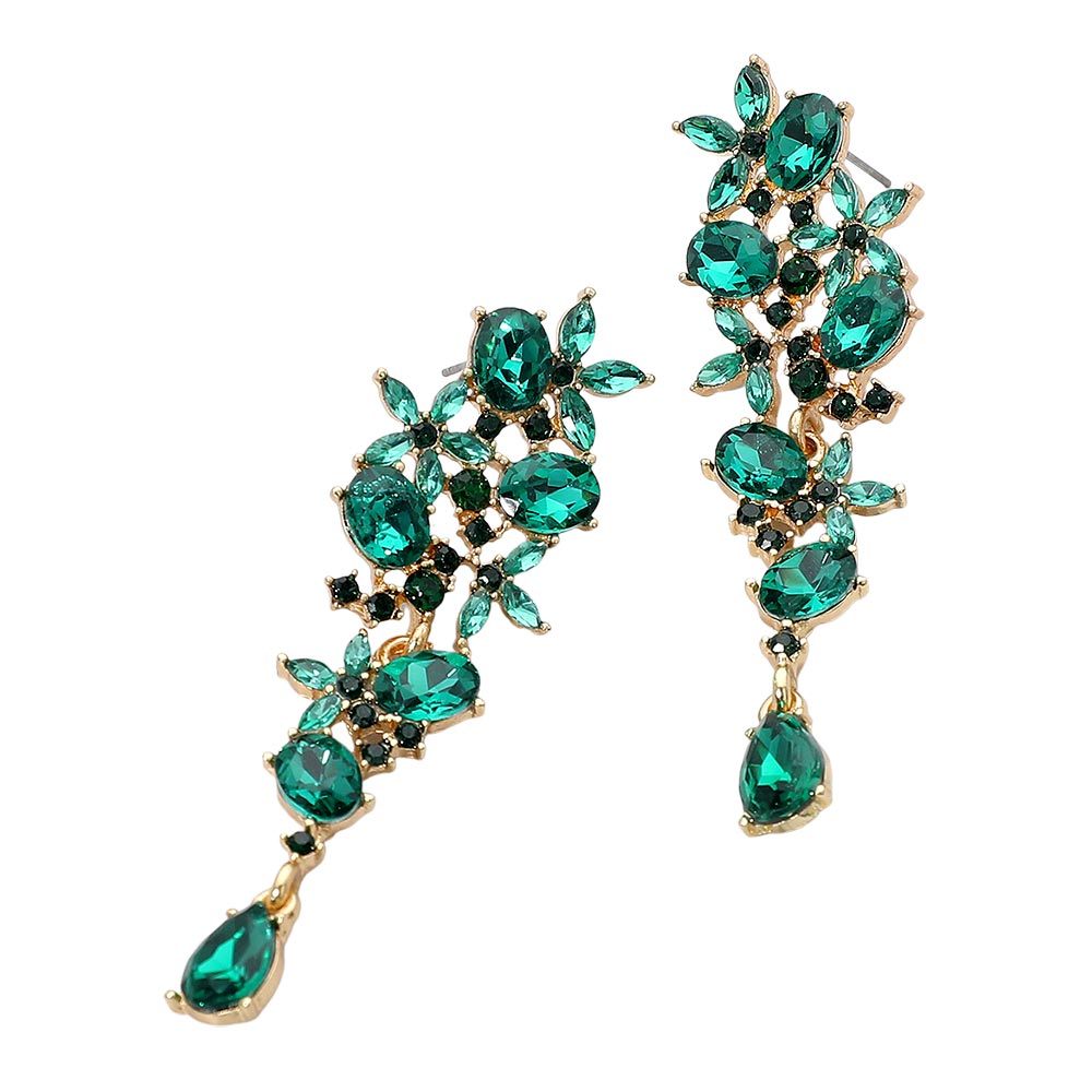 Details • Size : 0.8" X 2.7" • Post Back • These floral gem cluster drop earrings feature a graceful arrangement of marquise and oval-cut stones, creating a cascading botanical-inspired design. Perfect for evening wear or special occasions, they bring elegance and sparkle to any outfit with their intricate detailing and refined charm. • Lead and Nickel Compliant