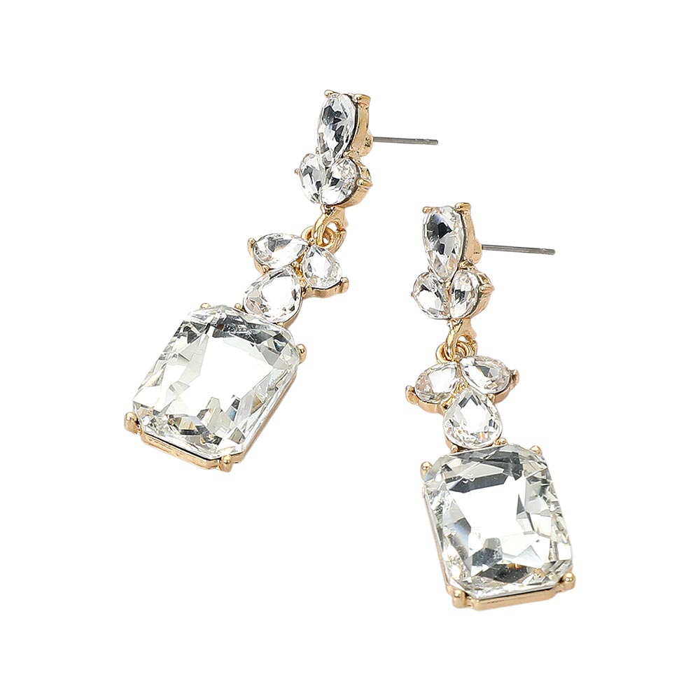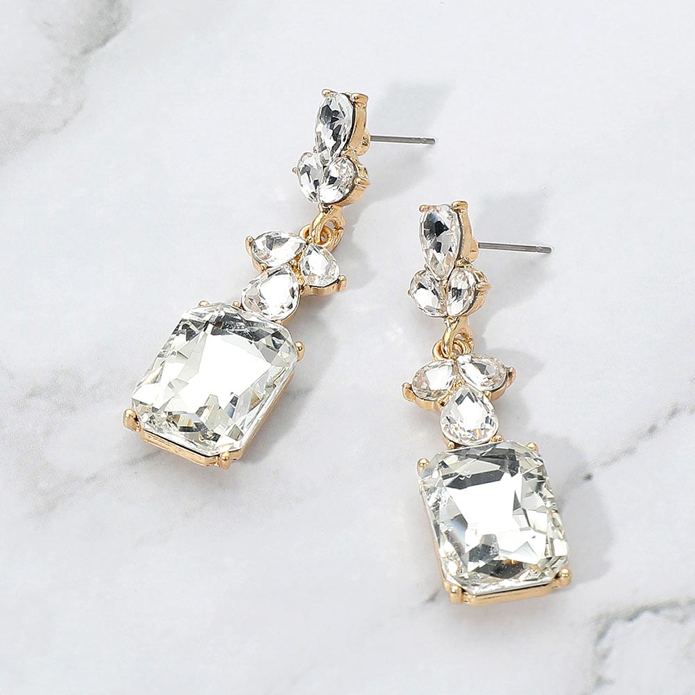 Details • Size : 0.5" X 2" • Post Back • These geometric drop statement earrings feature a bold, faceted design with a cascading arrangement of gem-like shapes. Perfect for adding a touch of sophistication to evening looks, they combine modern elegance with timeless glamour—ideal for special occasions or chic events. • Lead and Nickel Compliant