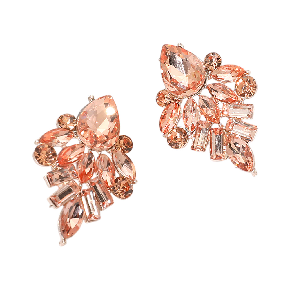 • Shine brilliantly with these radiant cluster stud earrings, designed with an array of faceted crystals in teardrop, oval, and baguette cuts. Their intricate arrangement adds a touch of glamour, making them the perfect accessory for special occasions or elevating your everyday chic look.