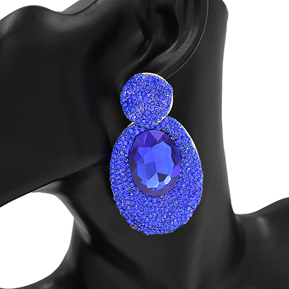 Oval Glass Stone Pointed Rhinestone Paved Dangle Evening Earrings