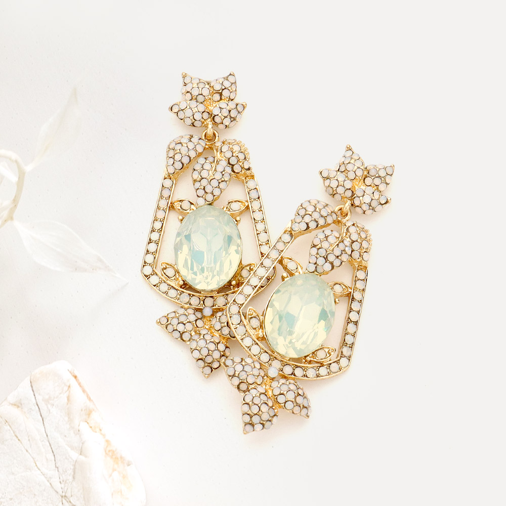 Oval Stone Accented Rhinestone Leaf Evening Dangle Earrings