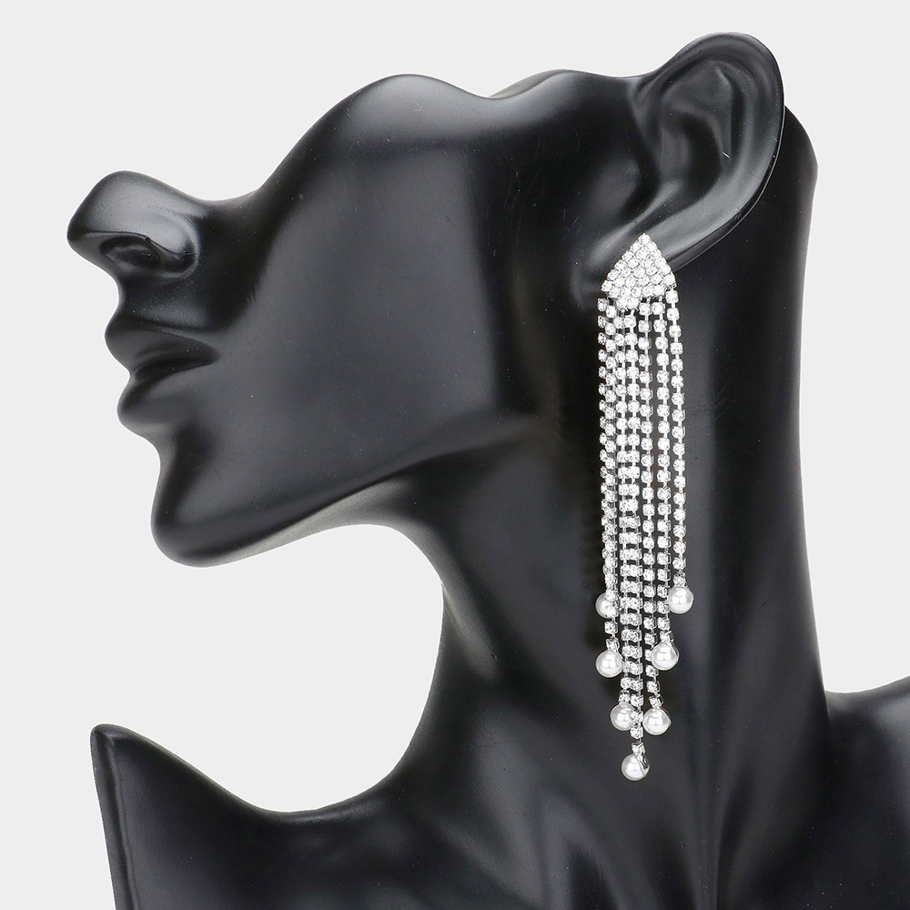 Round Pearl Tip Rhinestone Paved Fringe Evening Earrings