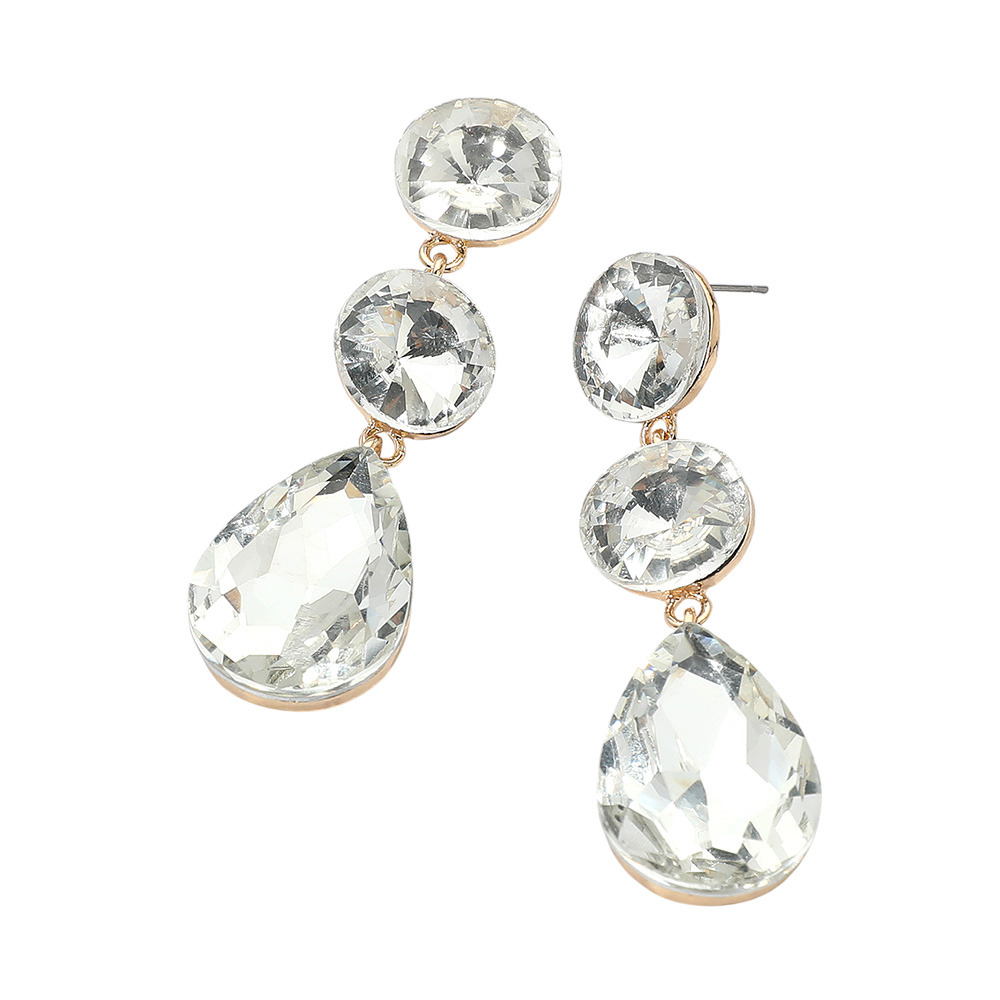 • Bold teardrop dangle earrings with faceted stones and round stud accents. Designed for a striking, glamorous touch, these earrings are ideal for evening events, weddings, or adding sparkle to any special occasion.