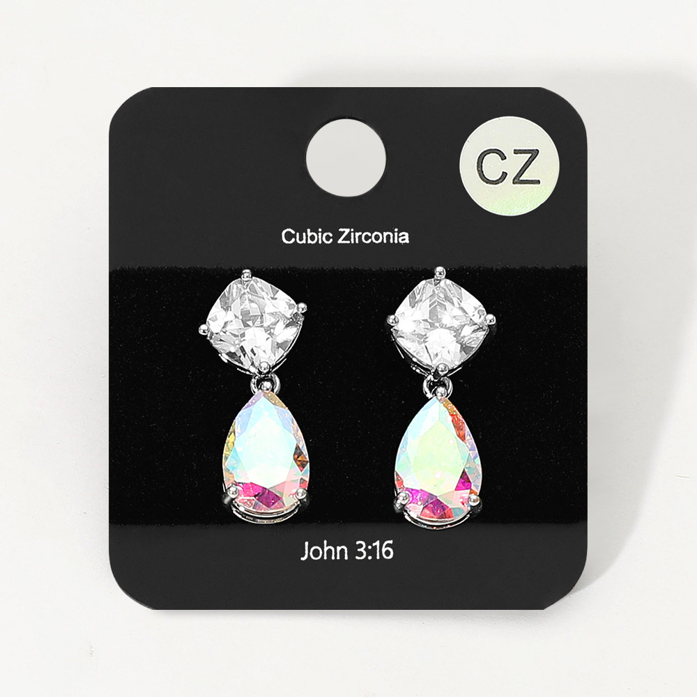 Details • Size : 0.4" X 1" • Post Back • These teardrop cubic zirconia drop earrings showcase dazzling brilliance with a radiant dual-stone design. The shimmering teardrop crystals catch the light beautifully, creating an elegant statement piece perfect for weddings, evening events, or adding sparkle to any outfit. • CZ Cubic Zirconia • Lead and Nickel Compliant