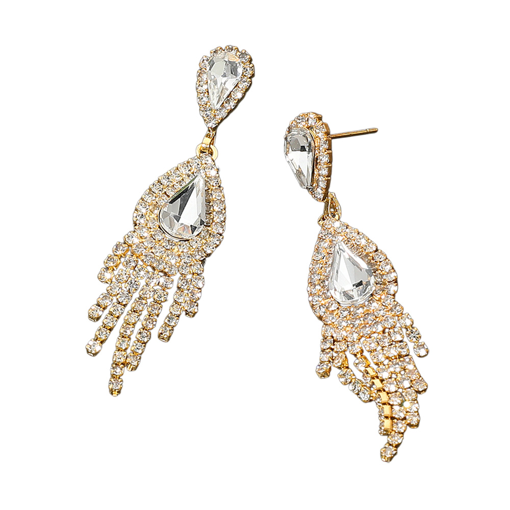Details • Size : 0.5" X 2.25" • Post Back • Dramatic teardrop crystal fringe earrings featuring layered halos and cascading strands for a bold, sparkling finish. Their elongated silhouette adds radiant movement, making them perfect for evening events, formal occasions, weddings, or any look that calls for high-impact glamour and shine.