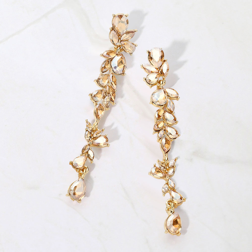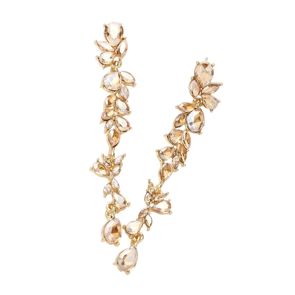 • These iridescent leaf drop earrings feature a cascading design of marquise and teardrop crystals that shimmer beautifully from every angle. Lightweight yet eye-catching, they bring a luminous touch to any outfit, making them ideal for special occasions or elegant evening wear.