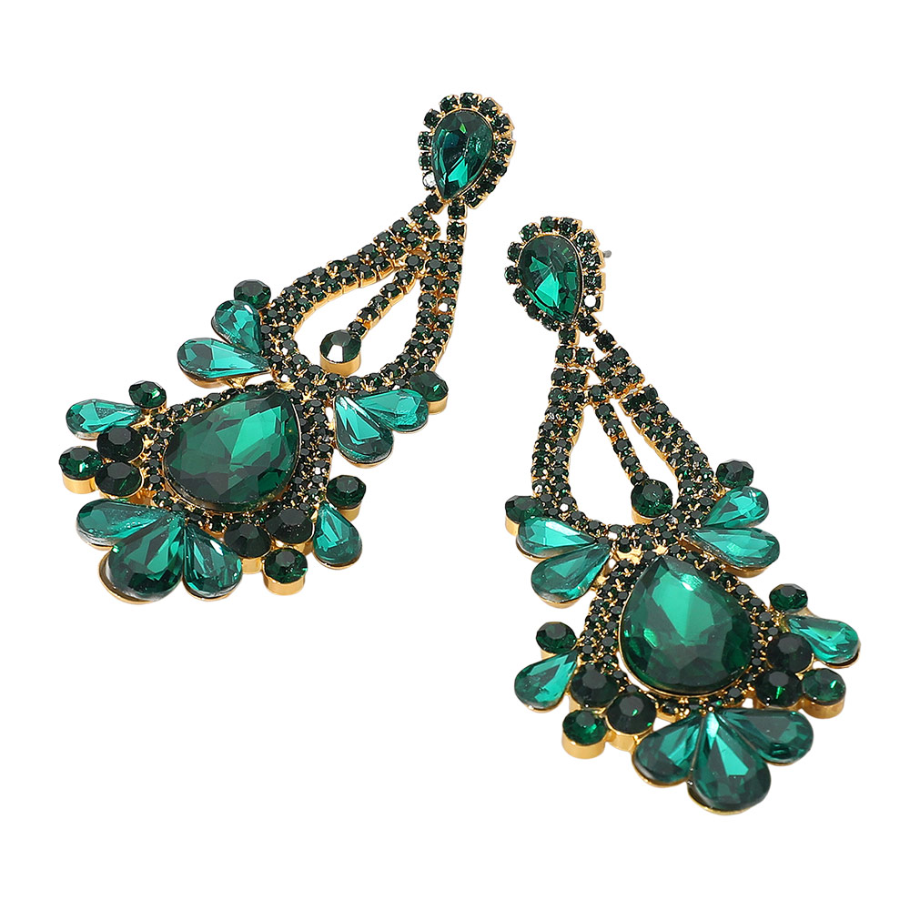 Details • Size : 1.5" X 3.1" • Post Back • Turn heads with these iridescent teardrop statement earrings, featuring a dazzling arrangement of shimmering stones and intricate detailing. Perfect for parties, weddings, and glamorous occasions, these earrings add a bold touch of sparkle and sophistication to any elegant look. • Lead and Nickel Compliant