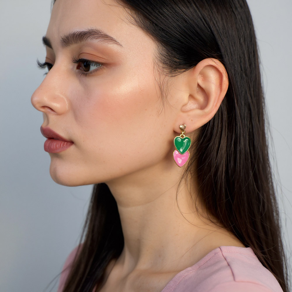 Details • Size : 0.5" X 1.2" • Post Back • Playful and chic, these double heart enamel drop earrings feature a vibrant layered design that adds charm and personality to any outfit. Lightweight yet eye-catching, they are perfect for everyday wear or as a fun statement piece for special occasions. • Brass • Gold Dipped • Hypoallergenic • Lead and Nickel Compliant • Made In Korea