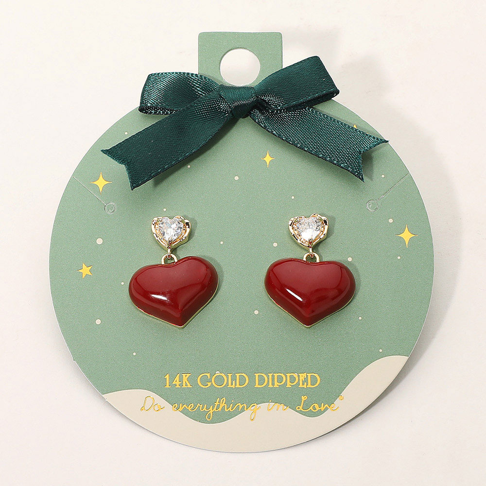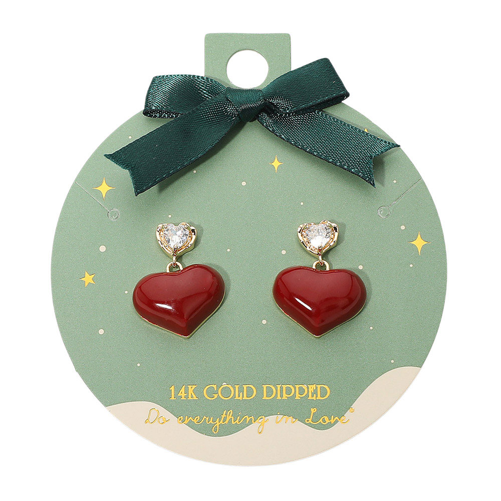 Details • Size : 0.75" X 0.9" • Post Back • Romantic heart drop stud earrings featuring a dazzling heart-shaped accent above a glossy heart charm for a sweet, elegant look. Their lightweight, festive design makes them perfect for gifting, seasonal outfits, date nights, or adding a touch of charm to everyday style. • Lead and Nickel Compliant • Hypoallergenic • Made In Korea • Gold Dipped