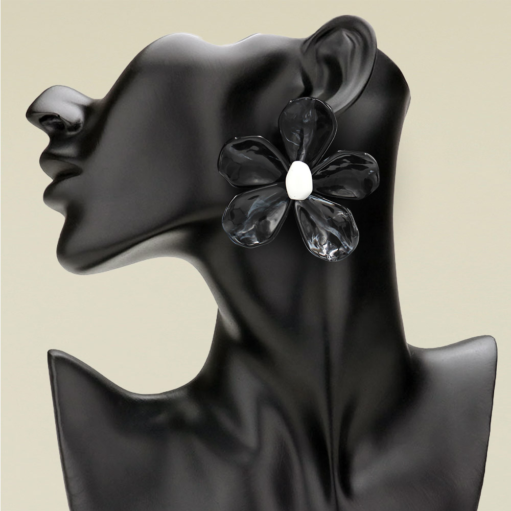 Details • Size : 2.5" X 2.5" • Post Back • Bold statement earrings featuring large petal-shaped floral design with glossy finish. Perfect for elevating any outfit, these eye-catching earrings add a touch of artistic flair and elegance, ideal for special occasions, photoshoots, or standout fashion looks. • Lead and Nickel Compliant