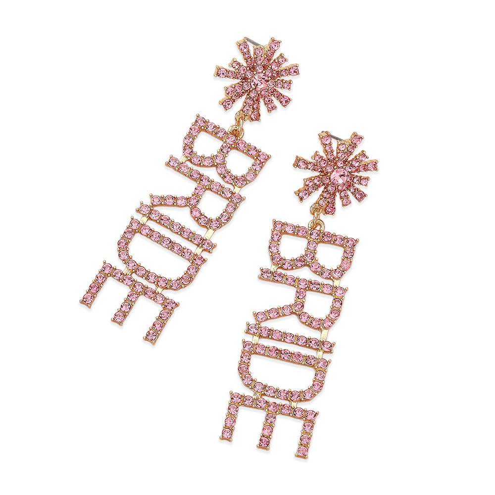 • Festive statement earrings featuring sparkling letter design spelling BRIDE, perfect for bachelorette parties or wedding celebrations. These fun and eye-catching earrings add a celebratory touch, making them ideal for standout bridal party accessories.