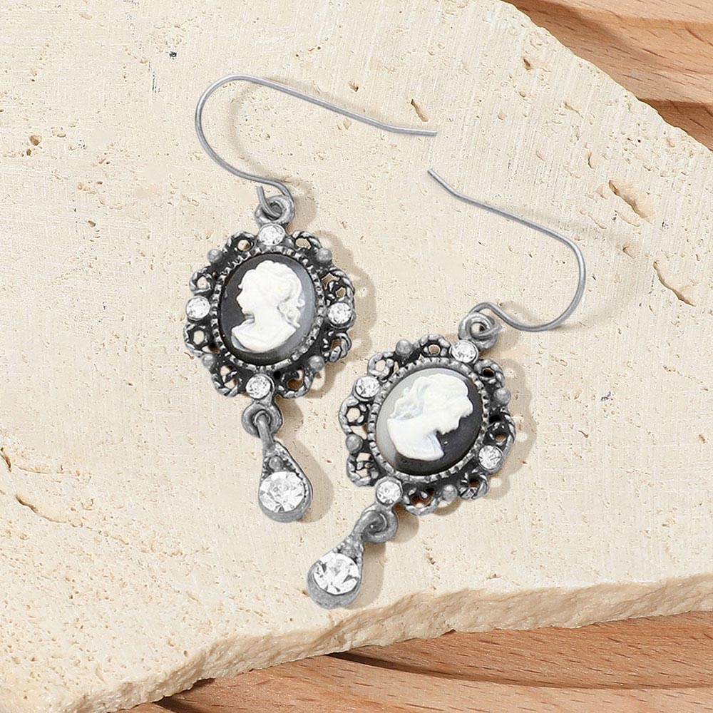 Details • Size : 0.6" X 1.6" • Fish Hook Back • Elegant vintage cameo drop earrings featuring detailed profile portraits framed with sparkling rhinestones and teardrop crystal charms. Perfect for adding a touch of timeless sophistication to both casual and formal outfits. • Made in USA • Lead and Nickel Compliant