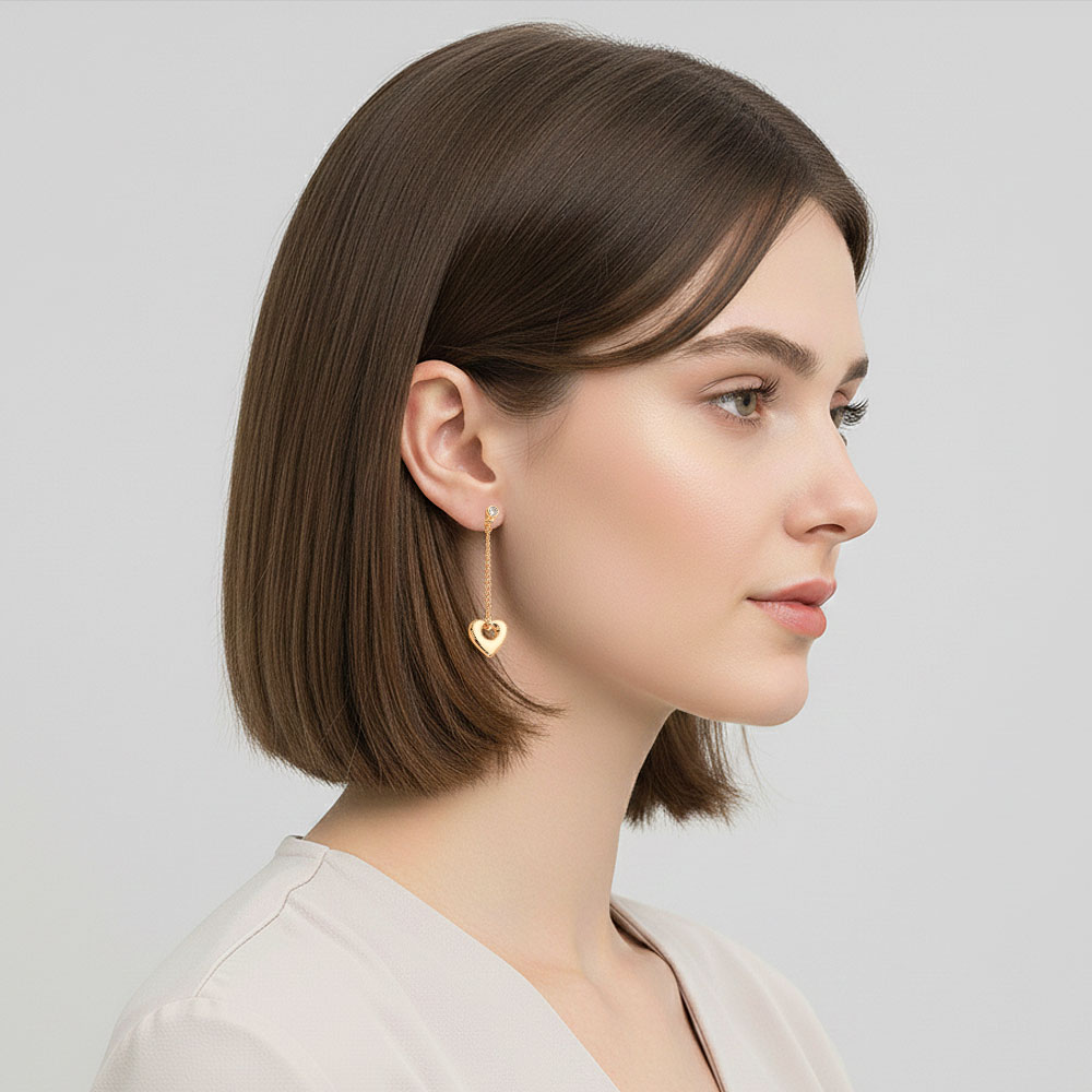 Details • Size : 0.5" X 2.1" • Post Back • Refined heart drop earrings with a delicate chained design that creates gentle movement and subtle sparkle. Perfect for adding romantic elegance to everyday outfits or enhancing evening looks, offering a lightweight, graceful accent that complements any jewelry collection beautifully. • Lead and Nickel Compliant