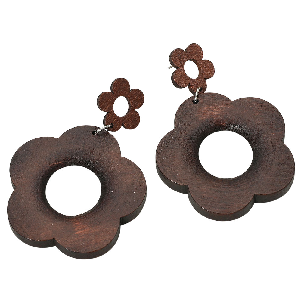 • Lightweight wooden earrings with a double-flower silhouette, featuring a small top flower and large open-center flower drop. A stylish statement accessory designed for casual wear, festivals, or gifting, offering a natural, artistic look without mentioning material details.