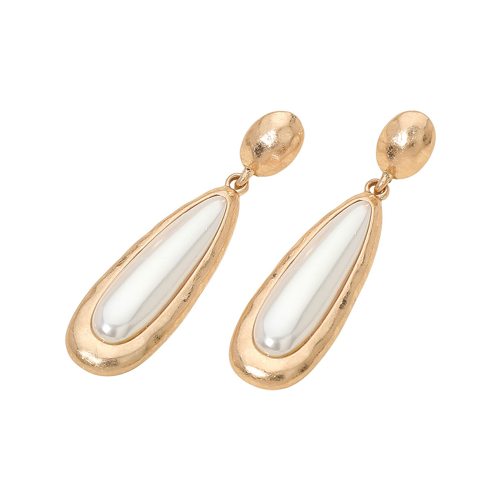 Details • Size : 0.6" X 2.2" • Post Back • These elongated teardrop statement earrings feature a sleek, polished centerpiece framed by a textured metallic design. Lightweight yet bold, they add modern sophistication to both casual and dressy looks, making them a versatile accessory for everyday wear or special events. • Lead and Nickel Compliant
