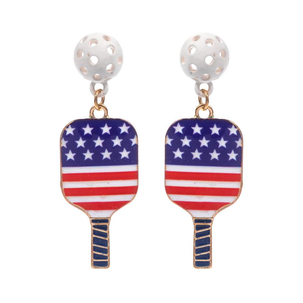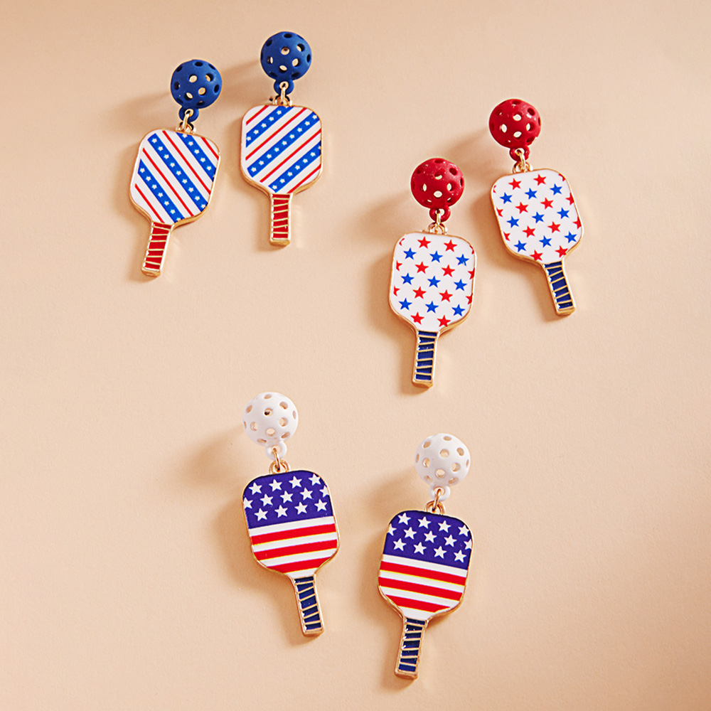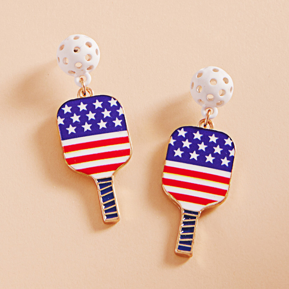 Enamel American USA Flag Pickleball Paddle Dangle Earrings