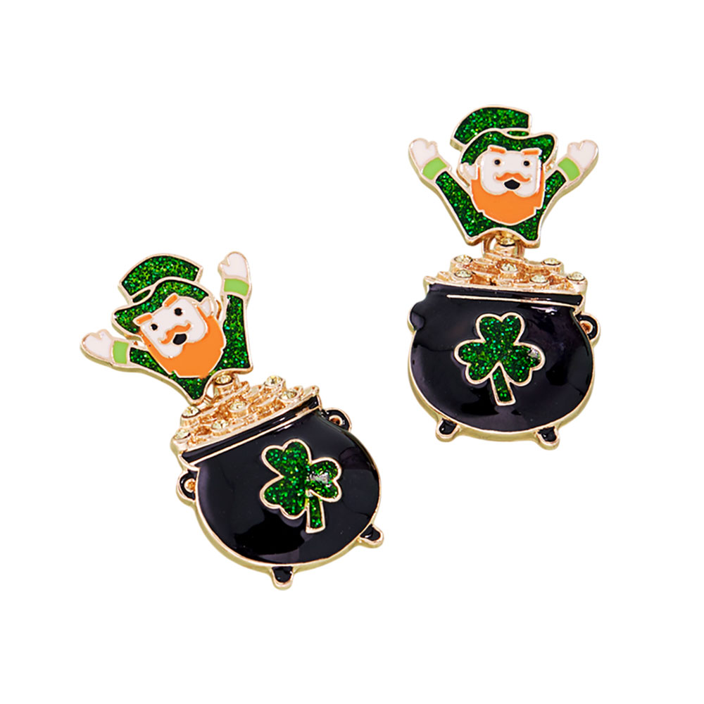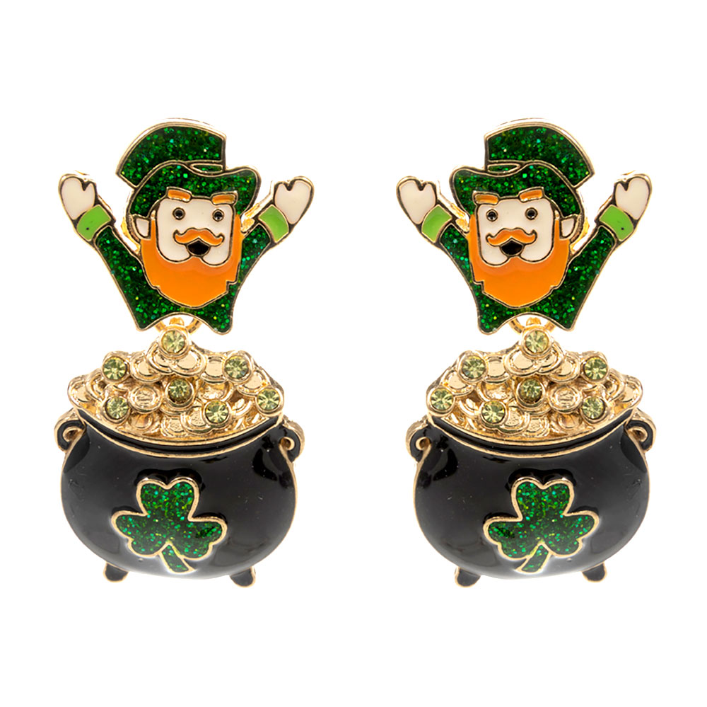 Details • Size : 0.8" X 1.7" • Titanium Post Back • Whimsical drop earrings featuring a playful leprechaun figure paired with a dimensional cauldron charm for festive flair. Lightweight and comfortable for all-day wear, these novelty earrings add eye-catching movement and fun detail, making them ideal for seasonal celebrations, themed outfits, parties, and gift giving. • Hypoallergenic • Lead and Nickel Compliant