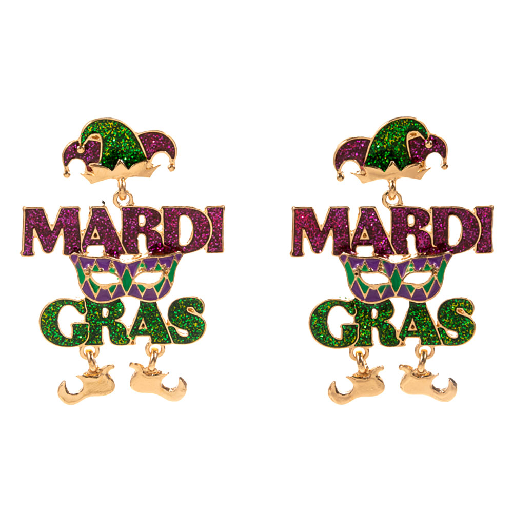 Details • Size : 1.4" X 2" • Titanium Post Back • Celebrate in true carnival style with these Mardi Gras Letter Drop Earrings. Featuring bold lettering, festive mask details, and sparkling accents, they’re the perfect statement accessory for parades, parties, or themed celebrations full of joy and flair. • Hypoallergenic • Lead and Nickel Compliant