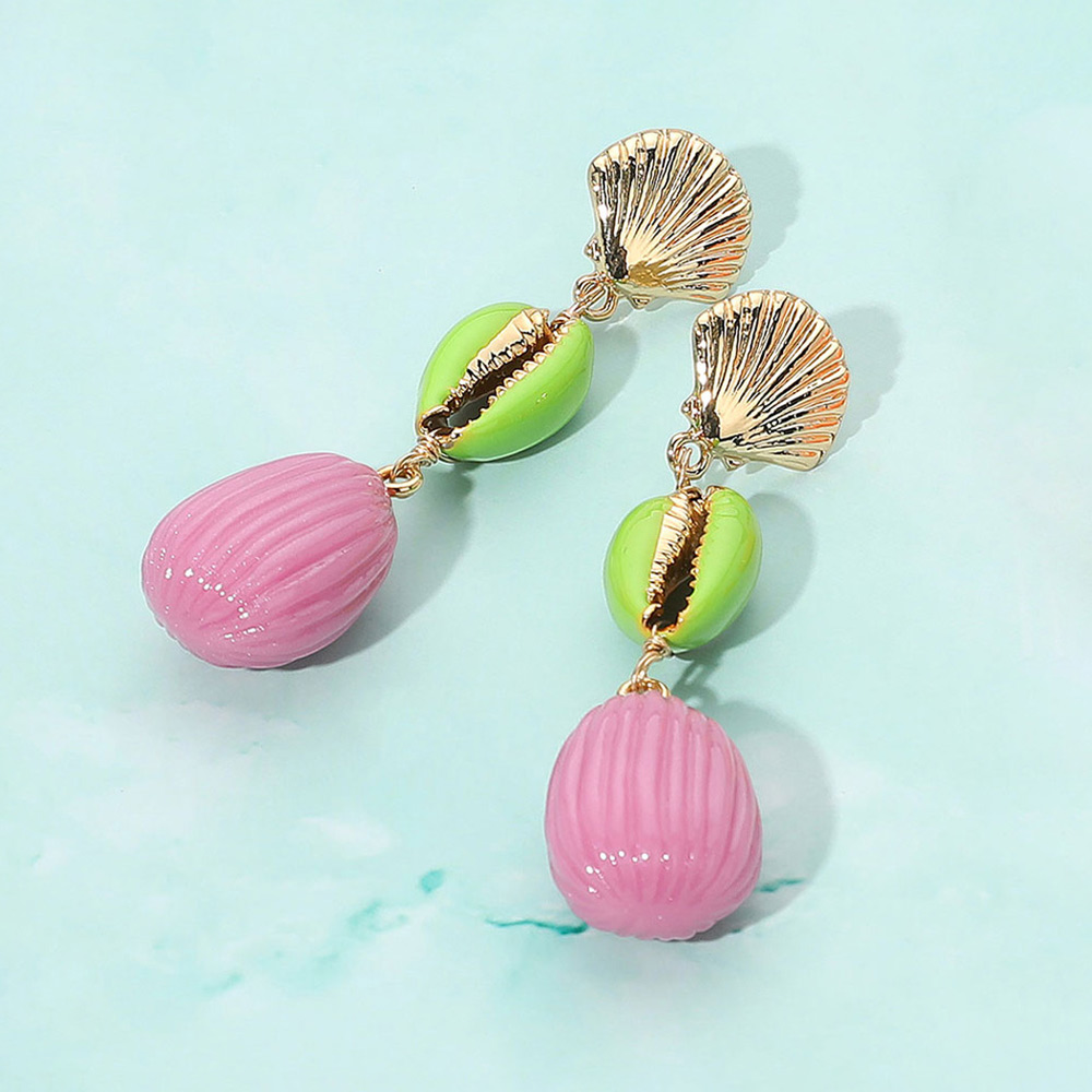 • Bring seaside charm to your look with these shell drop earrings, designed with a playful blend of textures and shapes. Perfect for vacations, summer outfits, or adding a beach-inspired statement to everyday style.