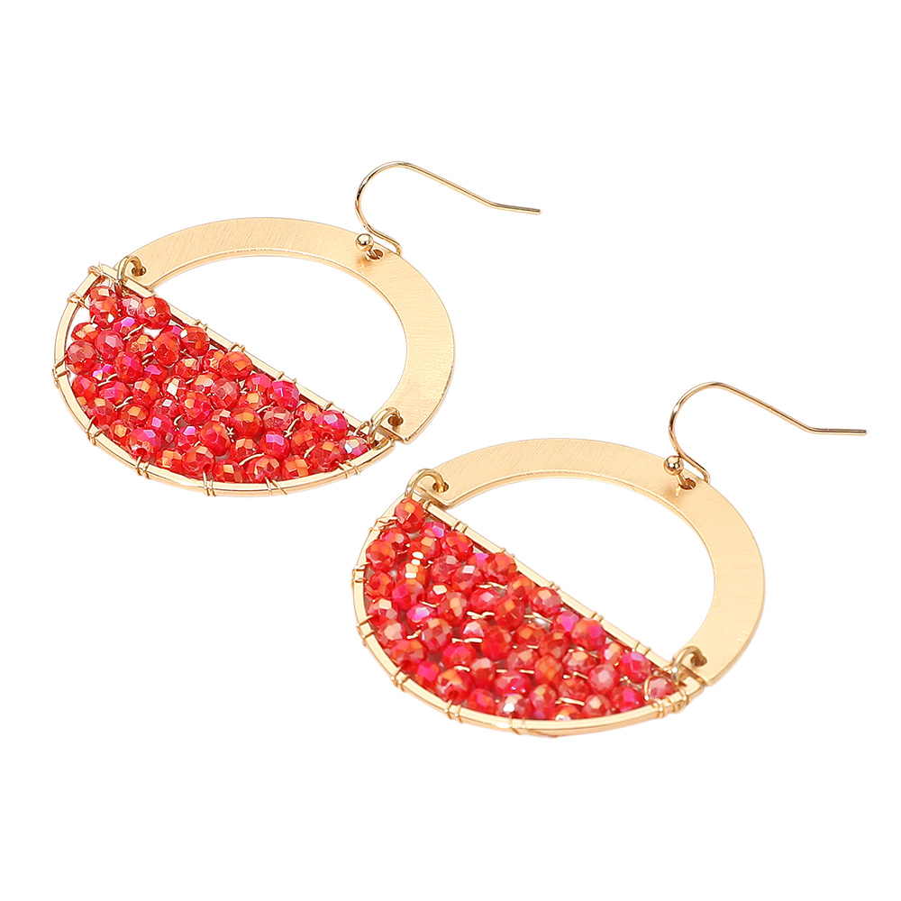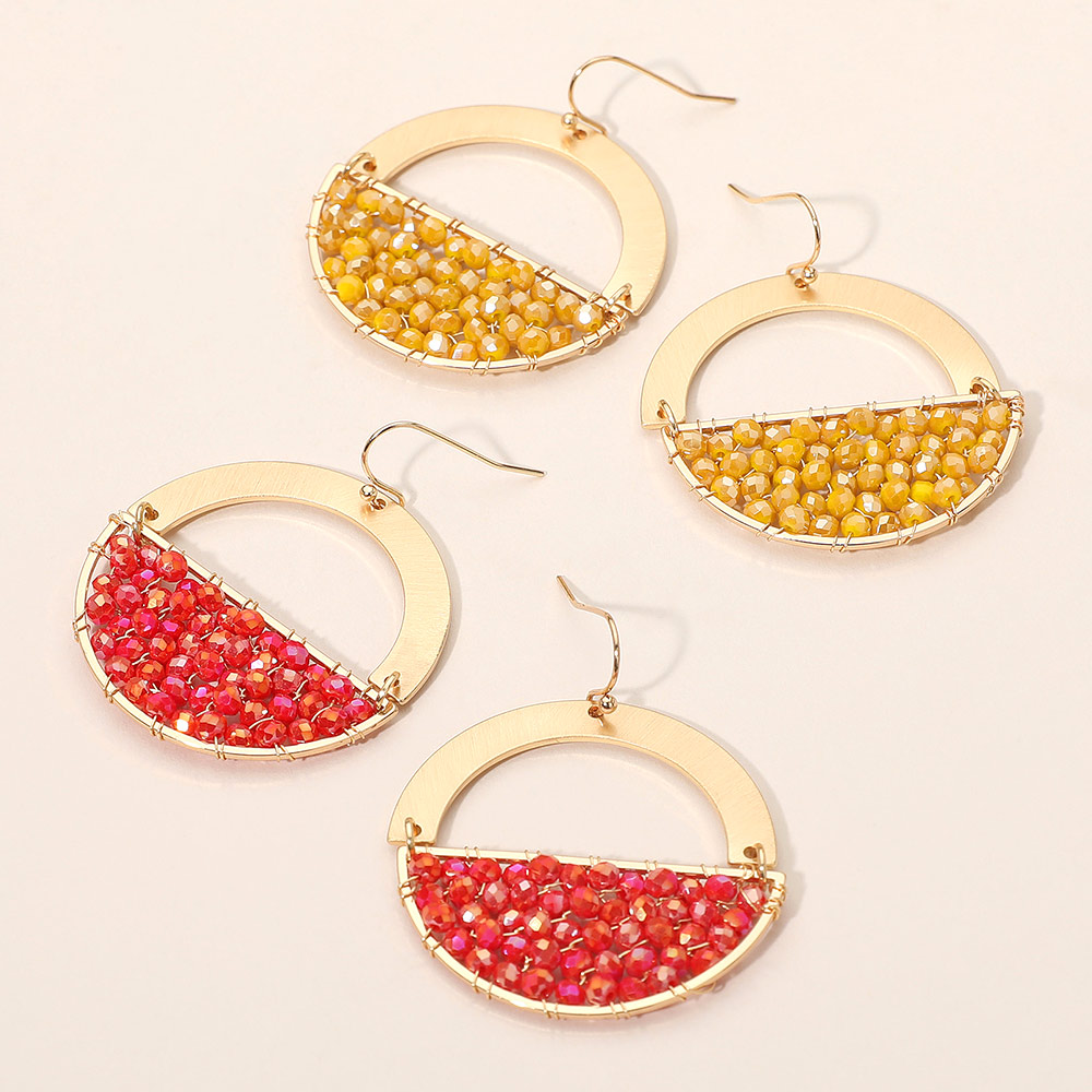 Details • Size : 1.6" X 2" • Fish Hook Back • Stand out with half-circle beaded dangle earrings featuring a chic geometric frame and sparkling bead accents. Lightweight and stylish, these earrings add a trendy statement to any outfit, perfect for both casual looks and evening wear. • Lead and Nickel Compliant