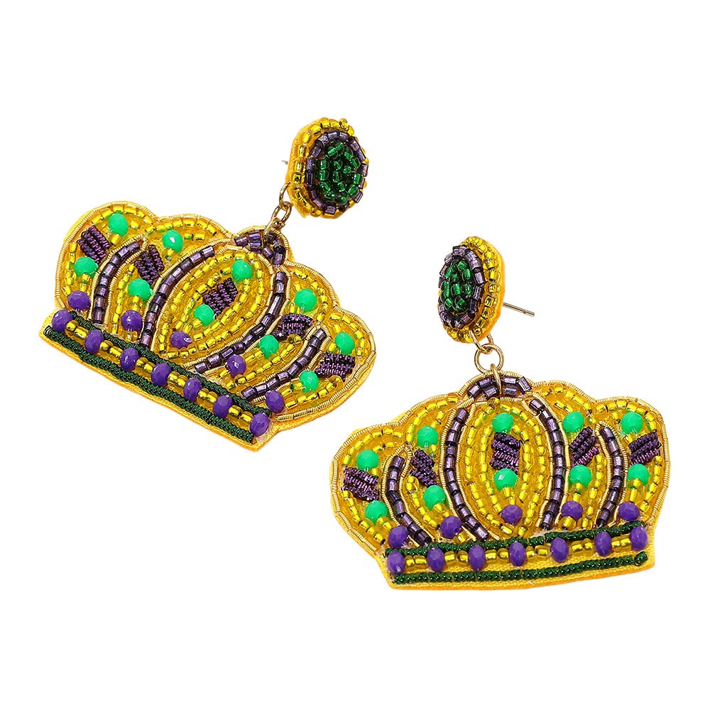 Felt Back Mardi Gras Multi Beaded Crown Dangle Earrings
