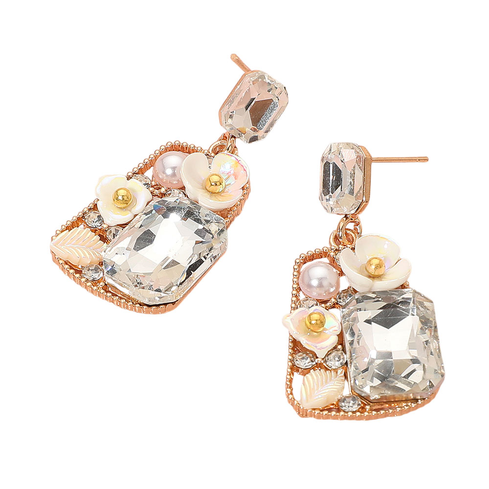 Details • Size : 0.8" X 1.75" • Post Back • Charming drop earrings featuring faceted crystals surrounded by petite enamel flowers, pearl accents, and delicate leaf motifs. The intricate detailing and radiant finish make these earrings a stunning choice for weddings, parties, or elegant evening looks. • Lead and Nickel Compliant