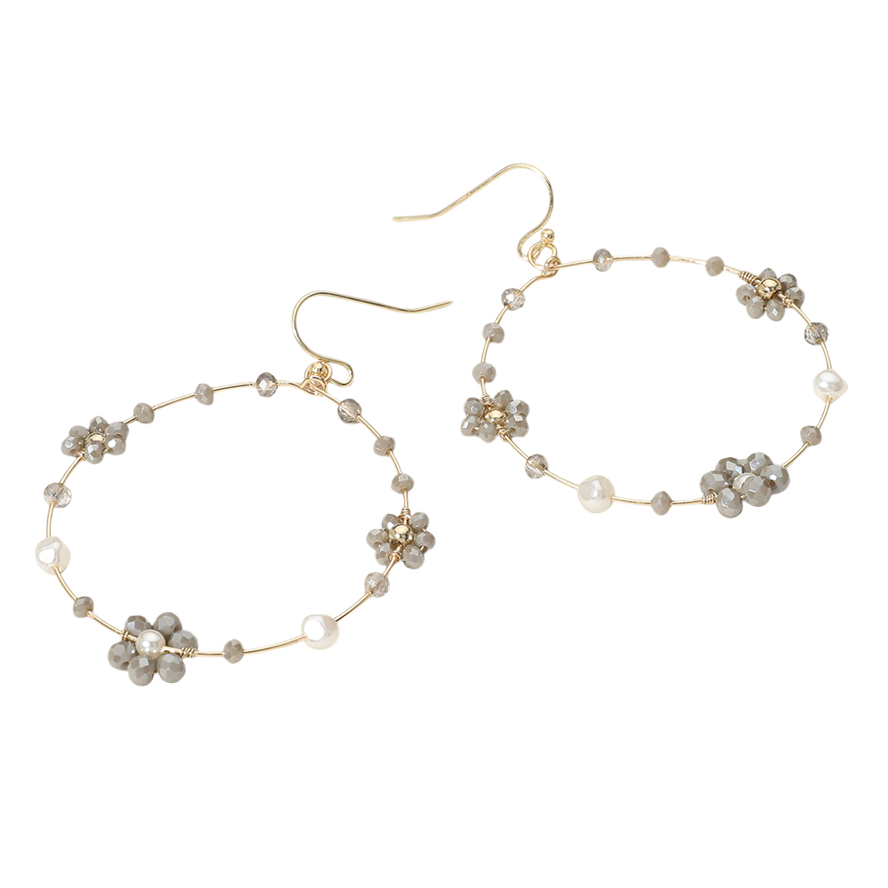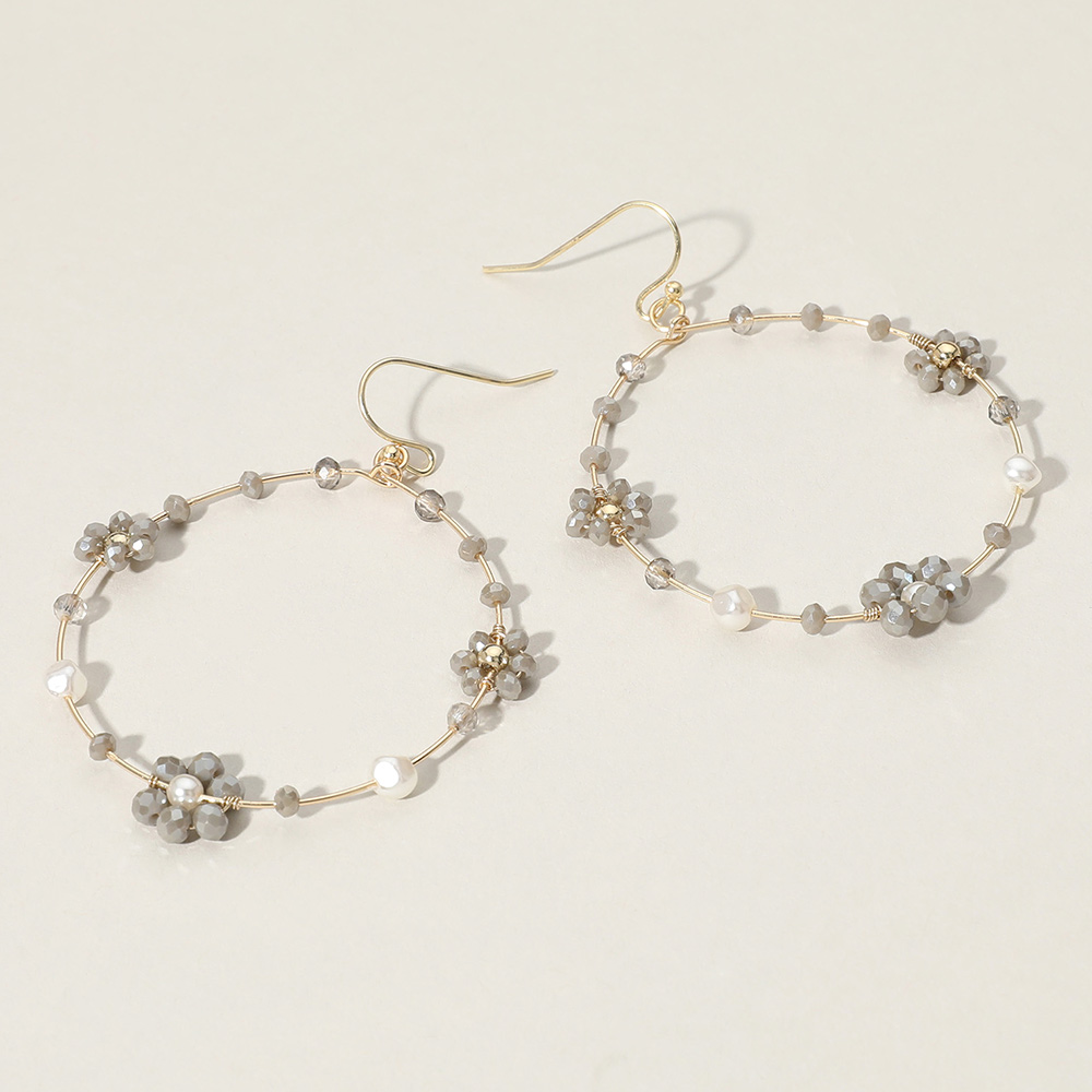 Flower Pearl Faceted Beaded Wire Round Dangle Earrings