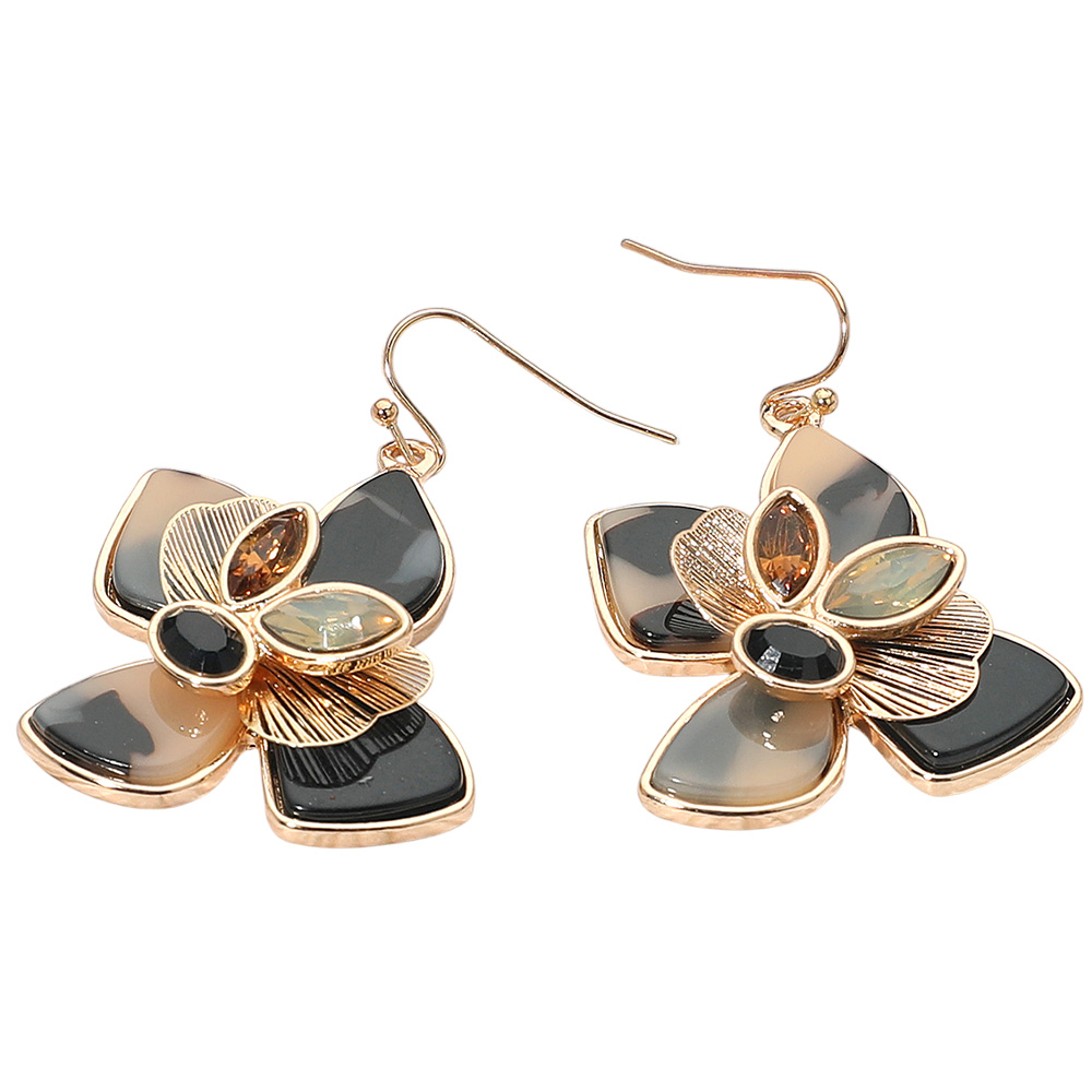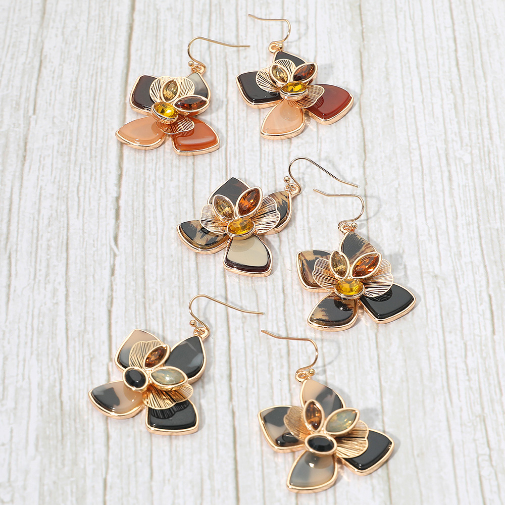Details • Size : 1.3" X 1.75" • Fish Hook Back • Add vibrant elegance to your look with these floral drop earrings. Featuring gemstone-inspired petals and subtle print accents, they combine bold design with feminine charm. Perfect for making a stylish statement at parties, evenings out, or special occasions. • Lead and Nickel Compliant
