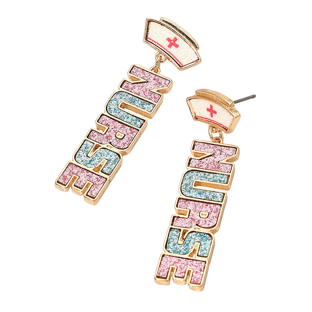Details • Size : 0.6" X 2" • Post Back • Bold vertical statement earrings featuring the word “Nurse” with charming accent details that celebrate caregiving pride. A fun standout accessory ideal for work celebrations, gifting, or adding playful personality to any outfit. • Lead and Nickel Compliant
