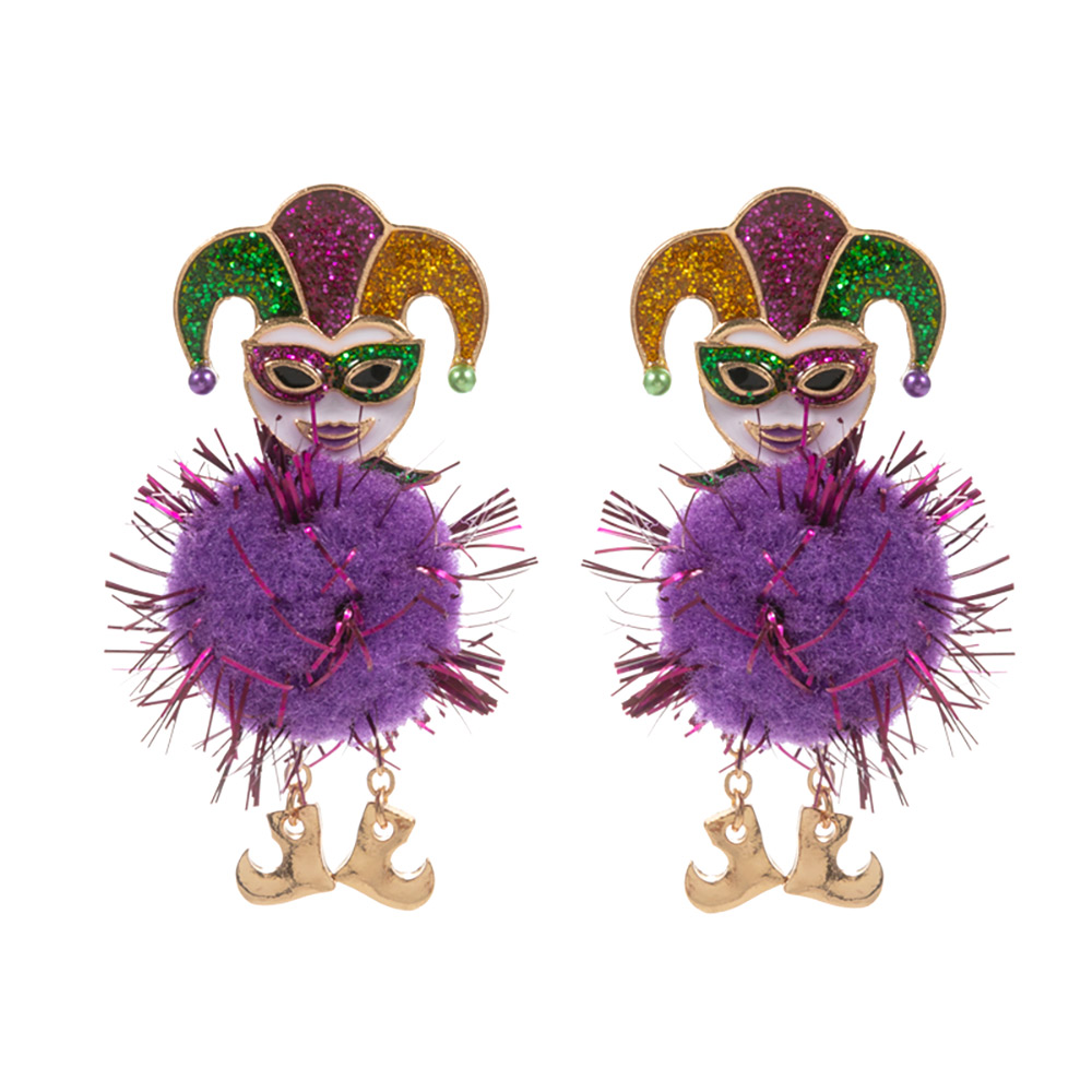 Details • Size : 1" X 2.1" • Titanium Post back • Festive Mardi Gras jester drop earrings featuring a playful mask motif and fluffy pom-pom accent. Designed to add bold carnival flair, these statement earrings bring lively movement and themed charm to celebration outfits, parties, parades, and holiday events. • Lead and Nickel Compliant • Hypoallergenic