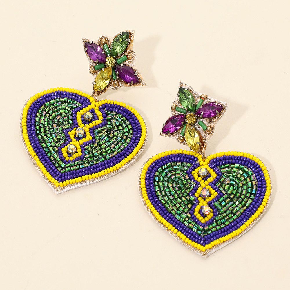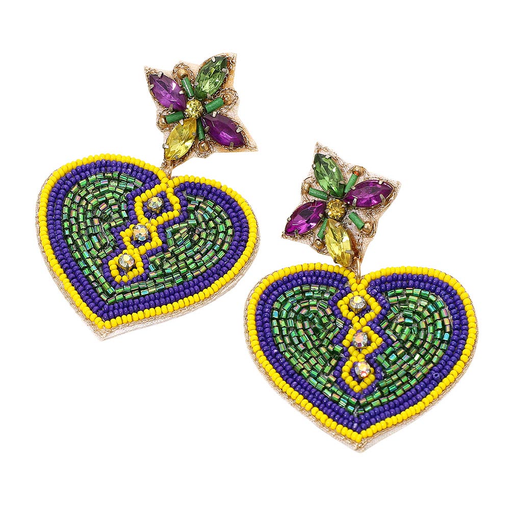 Details • Size : 2" X 2.6" • Post Back • Festive heart-shaped drop earrings designed with bold detailing and sparkling accents for standout Mardi Gras style. A playful statement piece perfect for parades, theme parties, costumes, or adding celebratory flair to everyday outfits and special events. • Lead and Nickel Compliant • Made In India