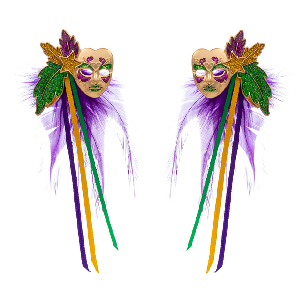 • Channel the mystery and glamour of carnival with these Mardi Gras masquerade feather earrings. Featuring ornate mask designs with cascading feathers and festive accents, they make a stunning statement for parties, parades, or costumes, capturing the magic and elegance of Mardi Gras celebrations.